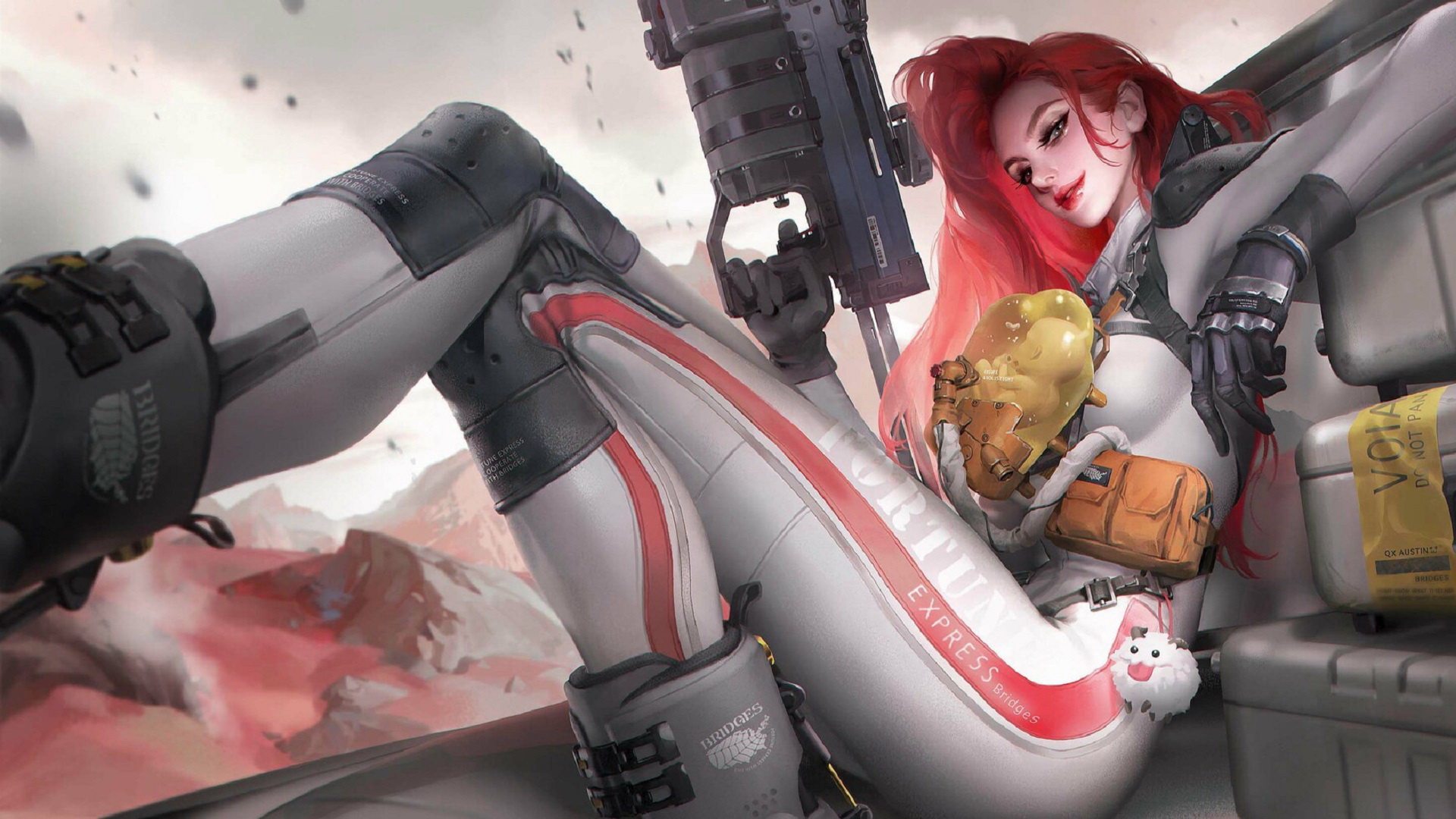 Description: A woman in a futuristic suit holding a gun and a gun in her hand.