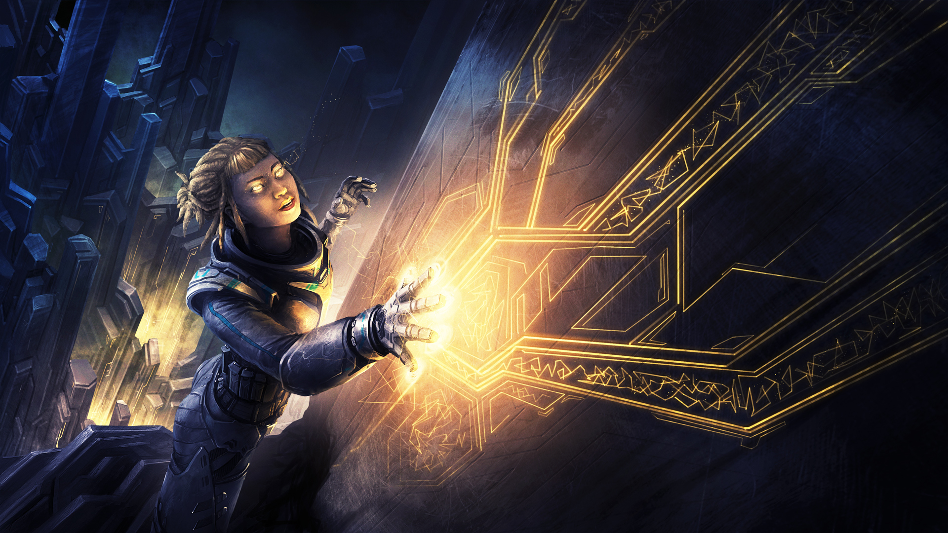 Description: A woman in a futuristic city holding a glowing object in her hand and looking at the camera with a glowing light in her hand.