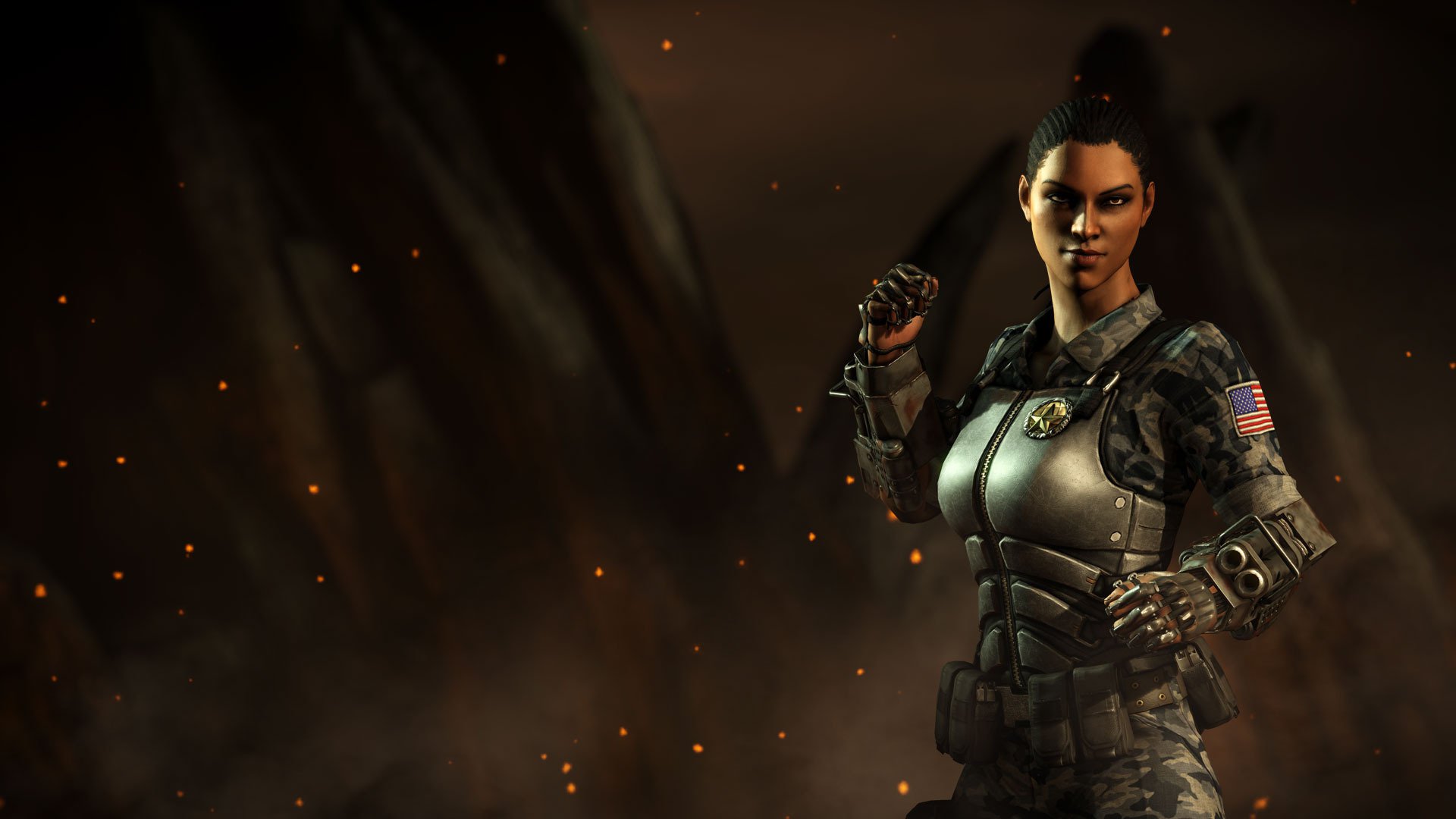 Description: A woman in a futuristic suit holding a gun in a dark background with smoke and stars around her.