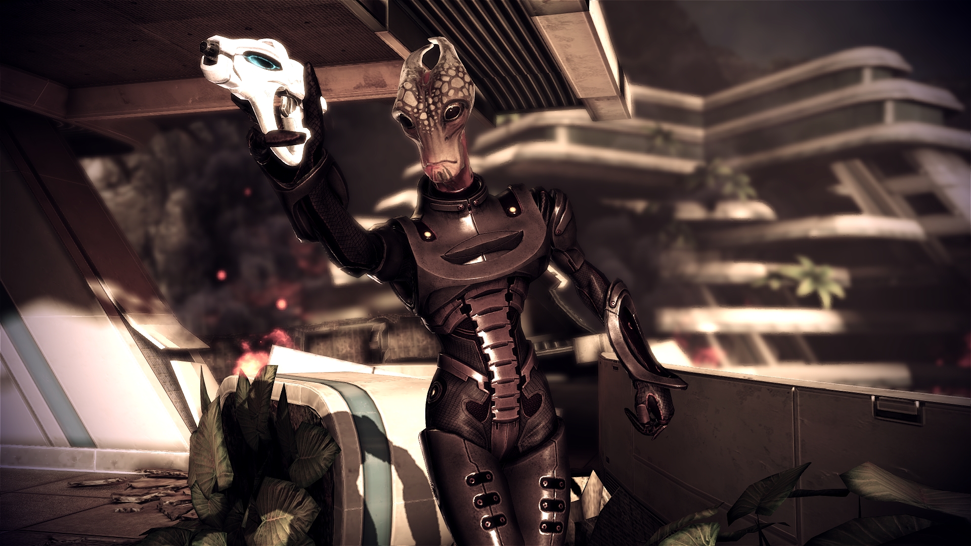 Description: A futuristic woman holding a gun in a futuristic city setting with a futuristic building in the background and a futuristic looking building in the foreground.