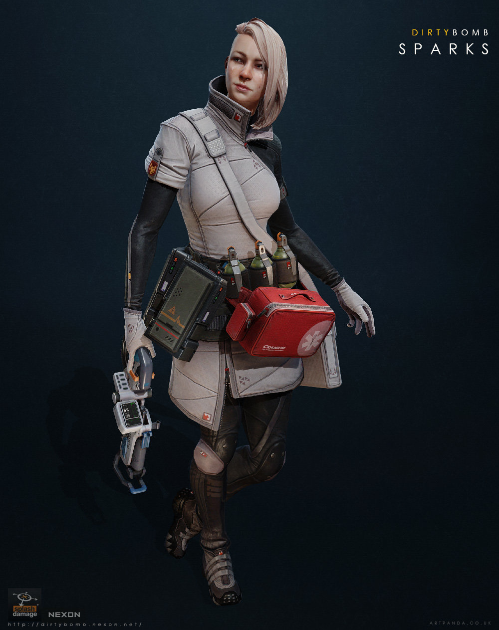 Description: A woman in a futuristic outfit holding a red box and a camera in her hand and a black background.