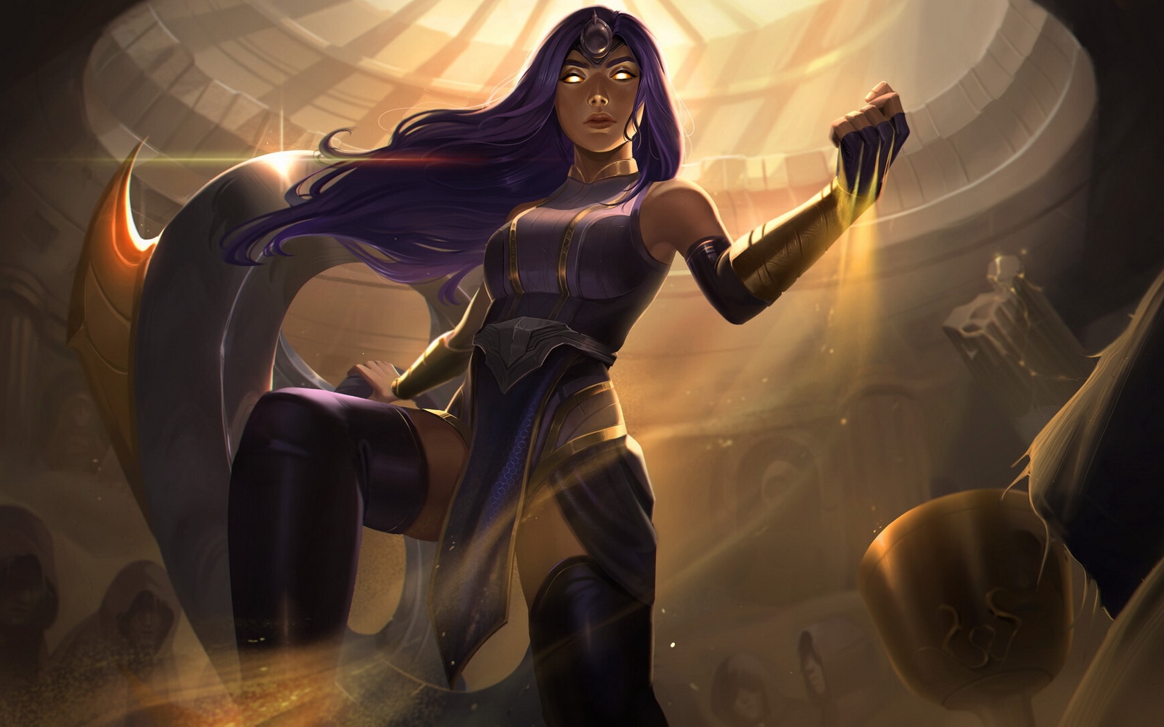 Description: A woman in a futuristic suit holding a sword in her hand and a glowing light behind her head and a large circular object in the background.