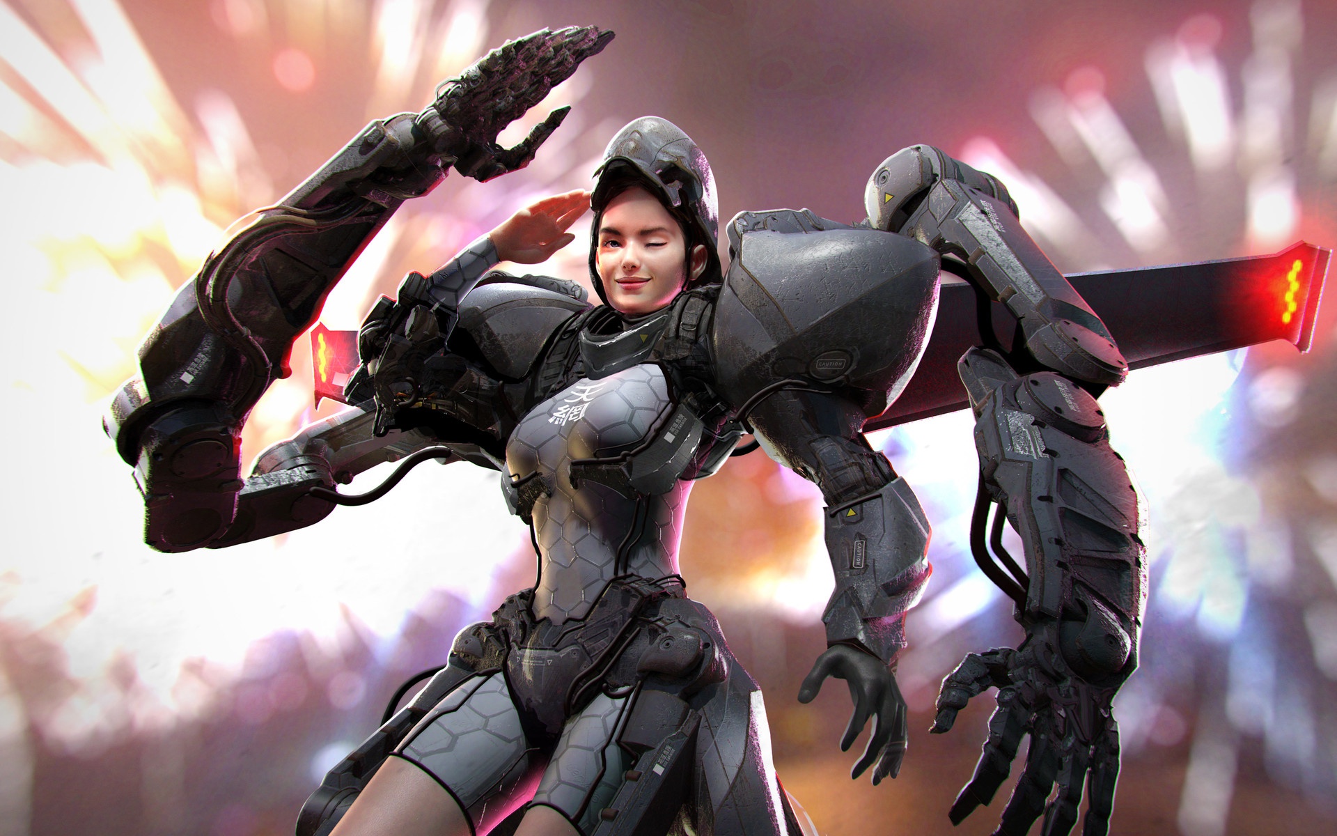 Description: A woman in a futuristic suit holding a sword and a light saber in her hand with fireworks in the background.