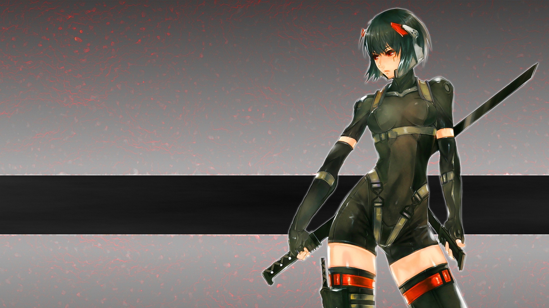 Description: A woman in a futuristic outfit holding a sword and a sword in her hand.