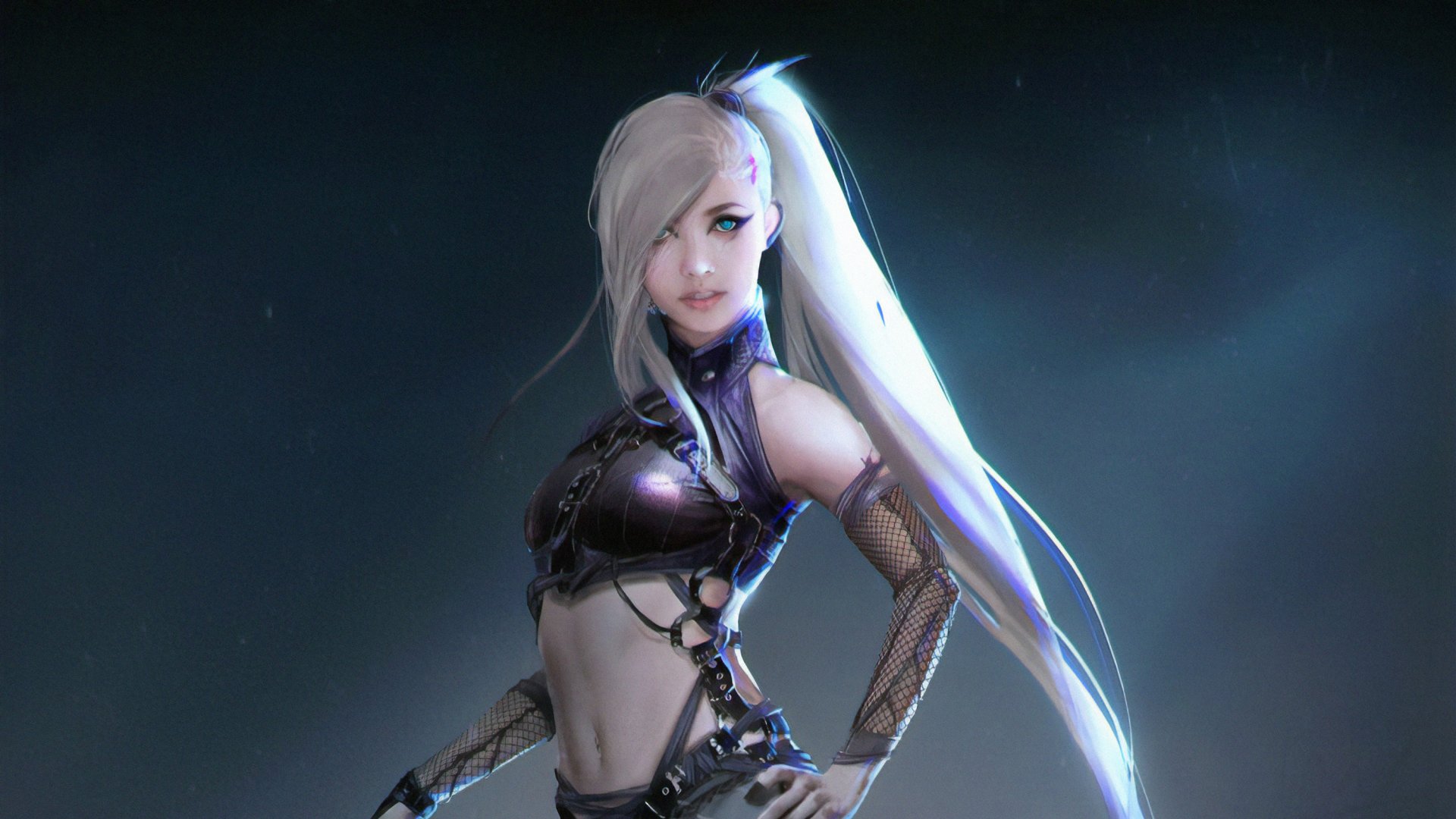 Description: A woman with long white hair and a futuristic outfit is standing in the dark with a sword in her hand.