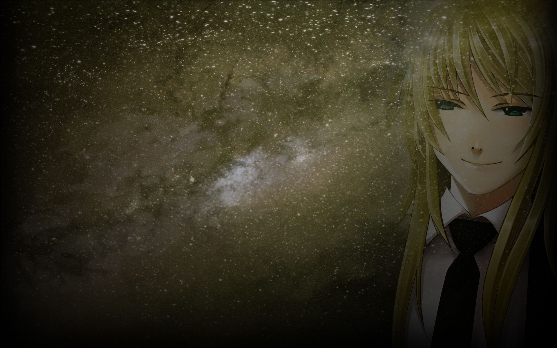 Description: A girl with long blonde hair and a tie standing in front of a galaxy background with stars and a black tie.