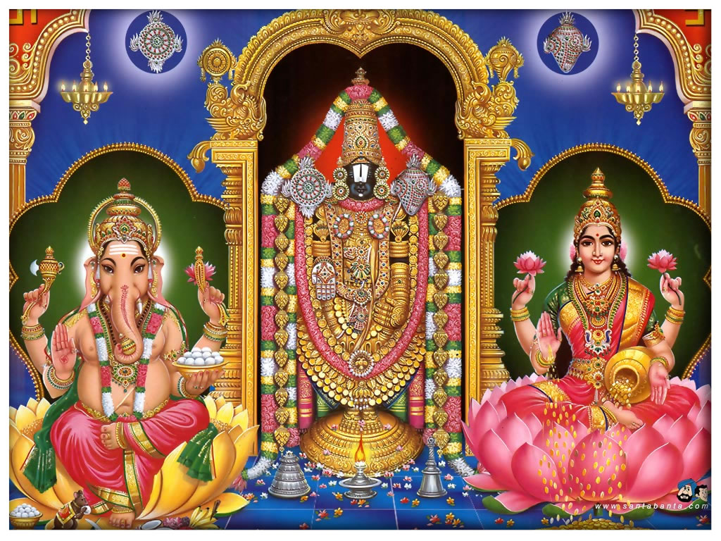 Description: A painting of a ganesha with two lotuses in front of it and a man in the background.