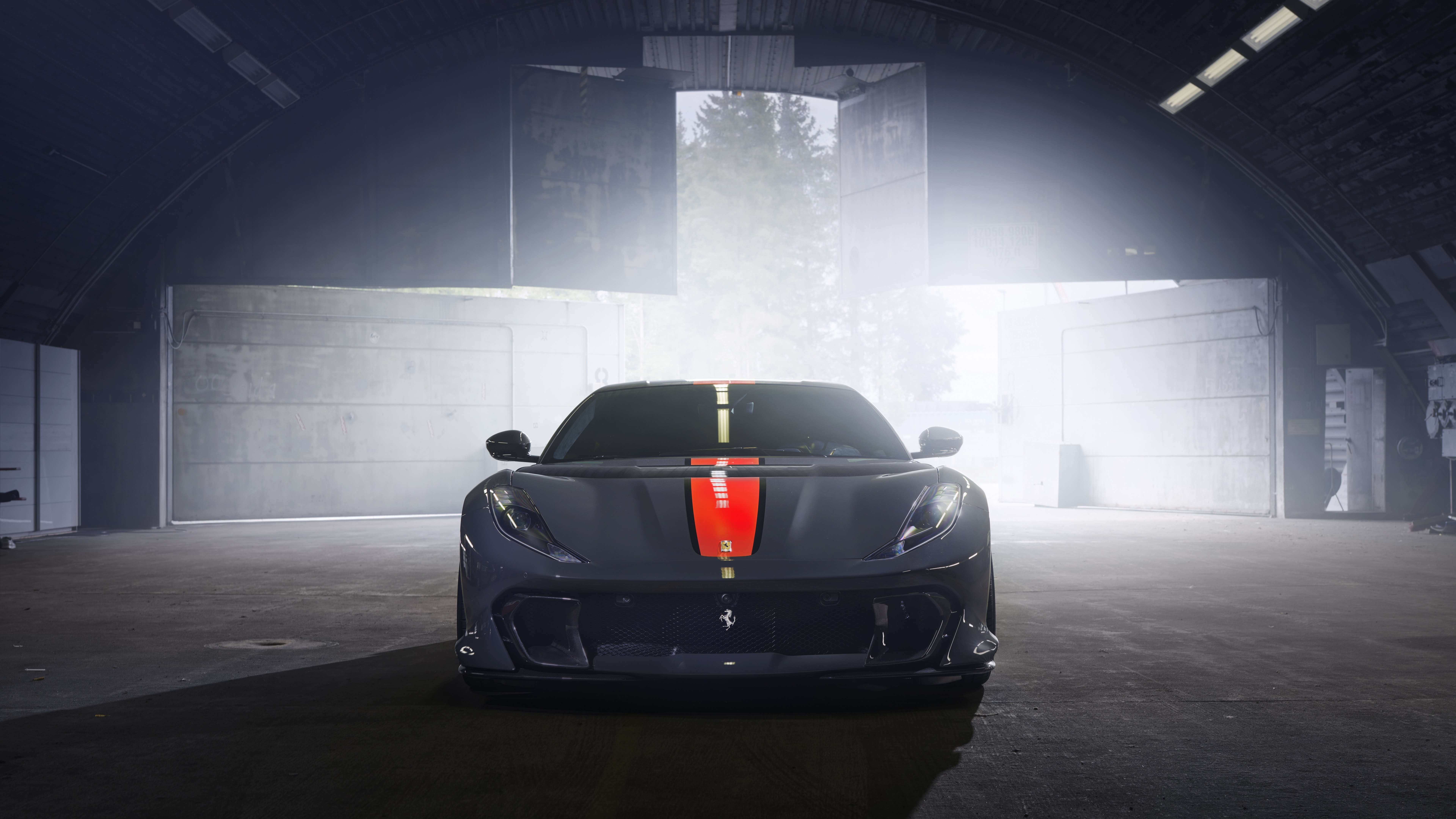 Description: A car parked in a garage with a bright light shining on it's side window and the hood.