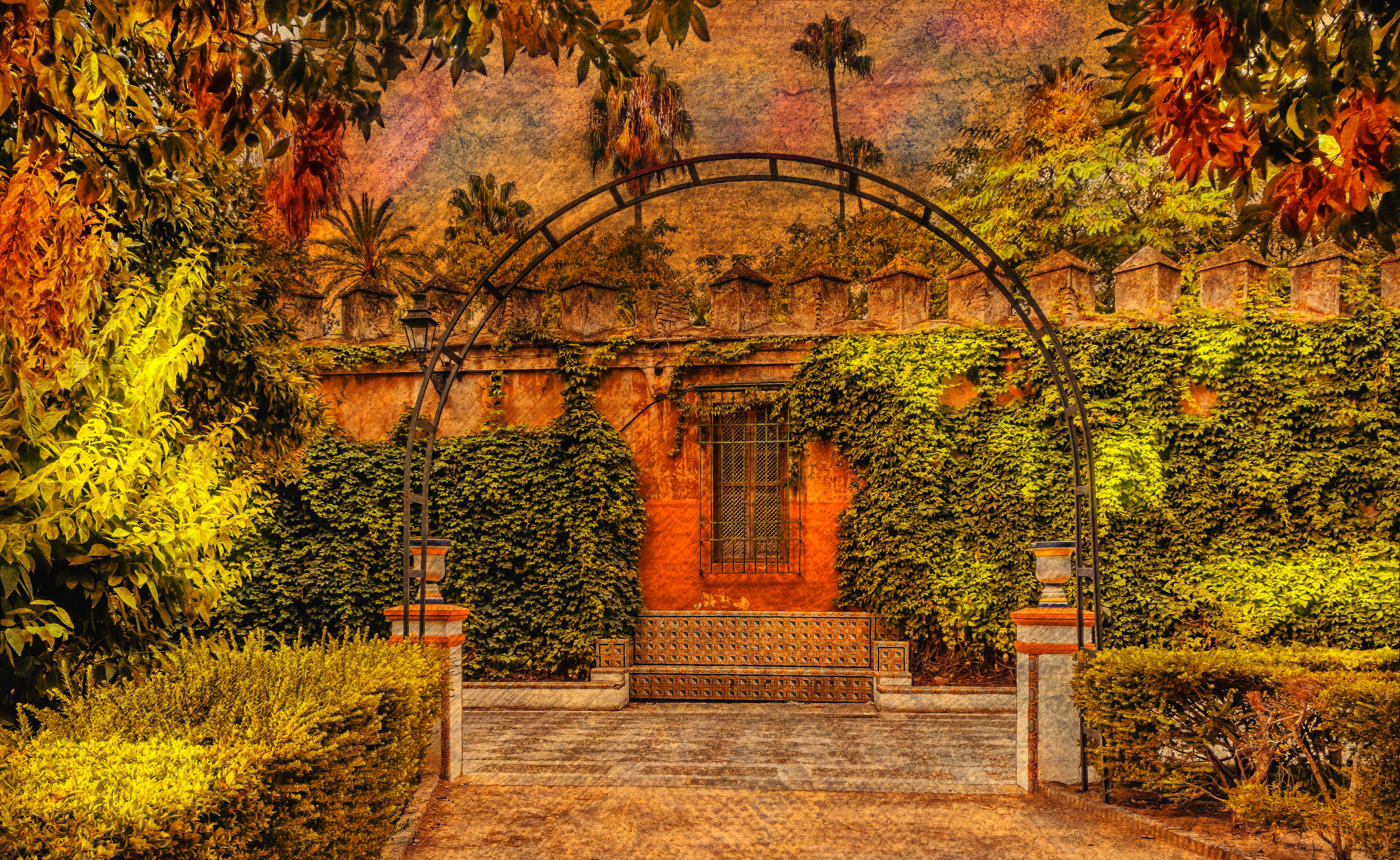 Description: A painting of a garden with a bench and a gate in the middle of it with a lot of green plants.