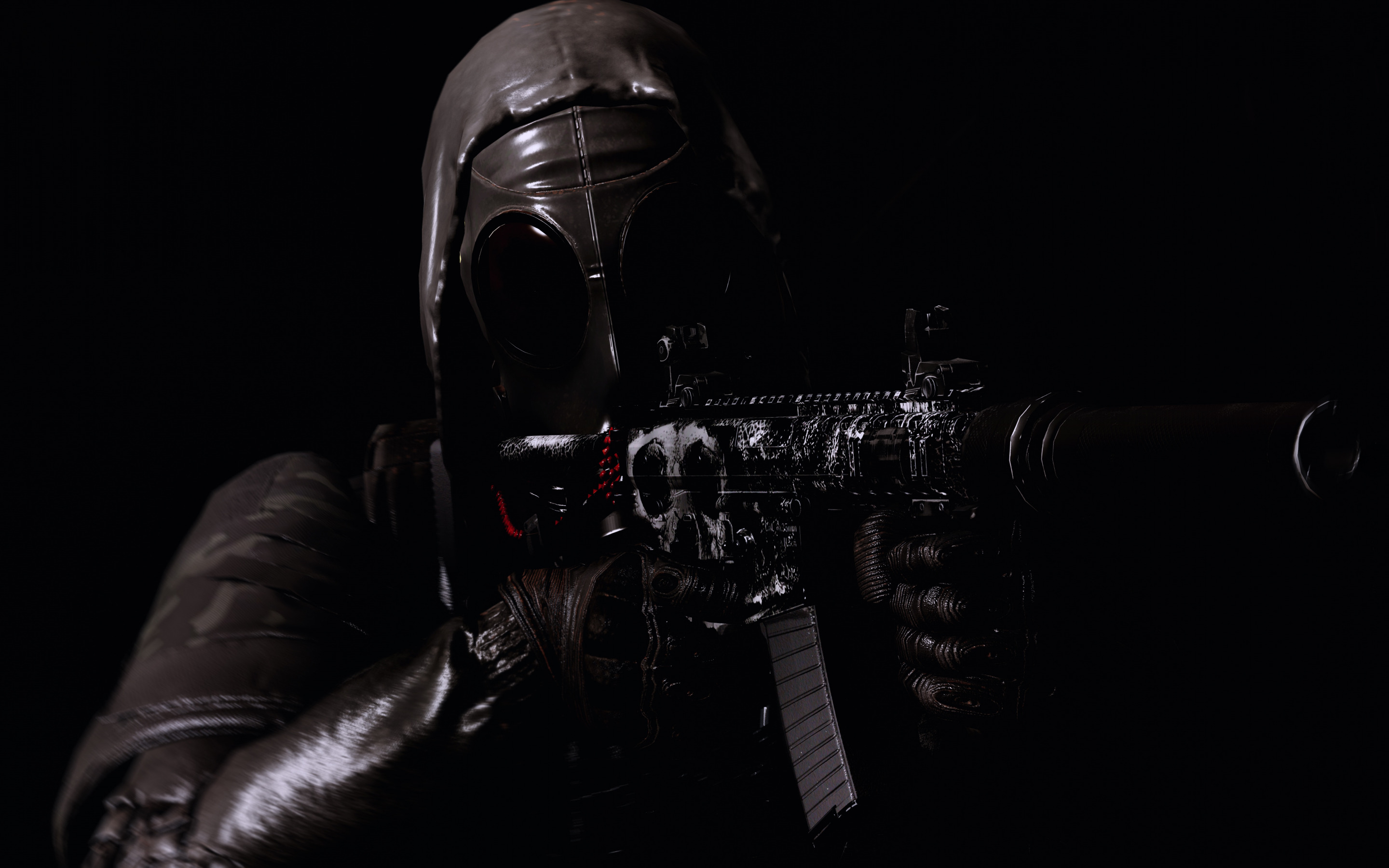 Description: A man in a gas mask holding a gun in the dark with a flashlight in his hand and a camera in his other hand.