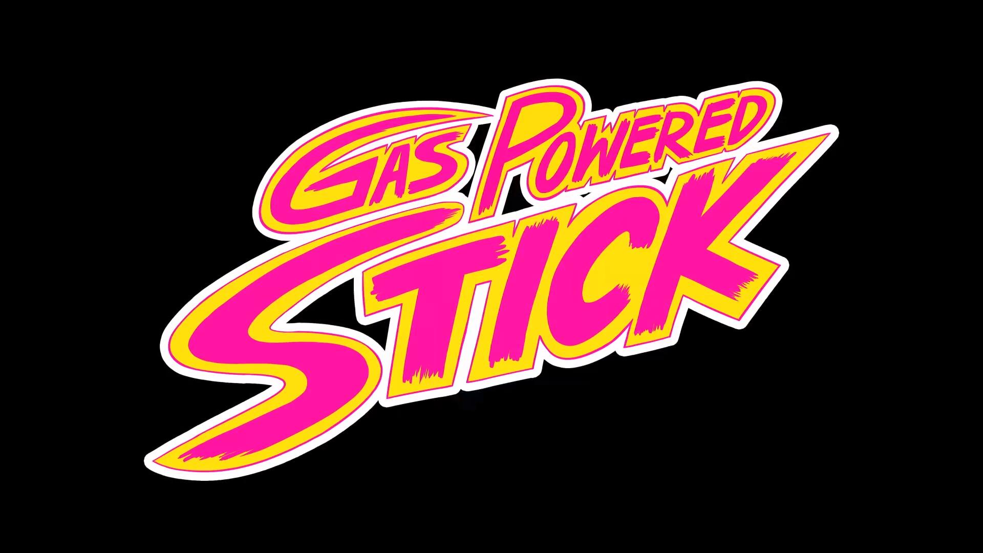 Description: A sticker that says gas powered sticker on a black background with pink and yellow lettering on it.