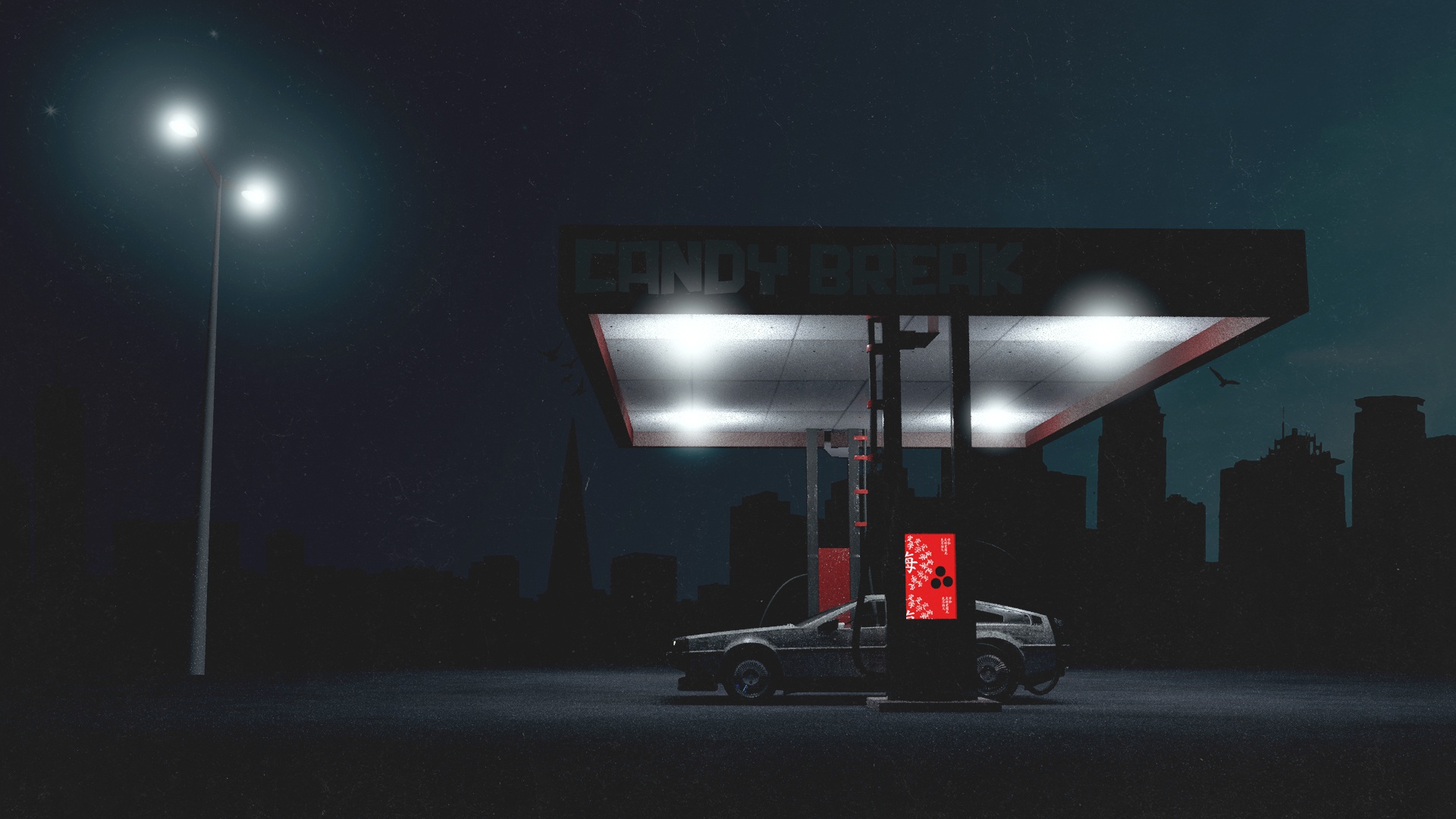 Description: A gas station with a red light at night time and a black truck parked in front of it at the gas pump.