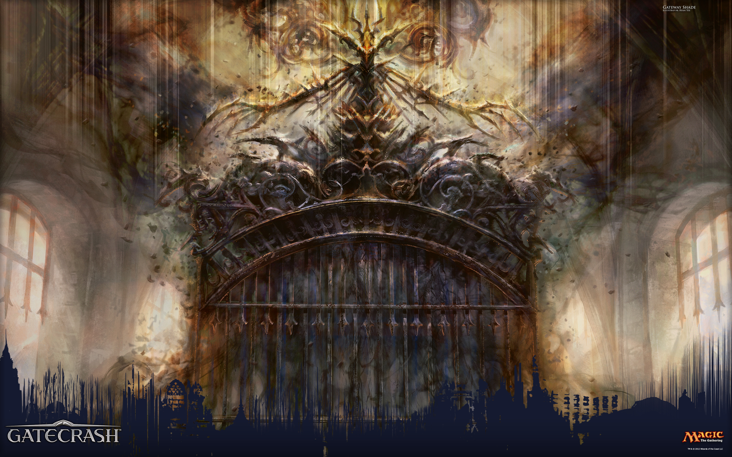 Description: A painting of a gate with a giant demon on it's face and a giant demon on the top of it.