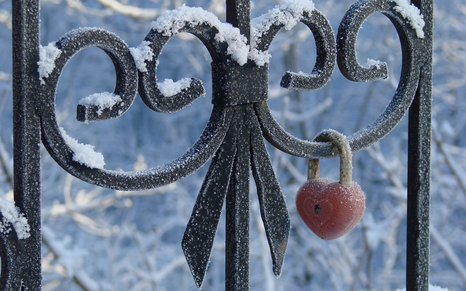 Description: A gate with a red ball hanging from it's side and snow on the ground behind it and trees in the background.
