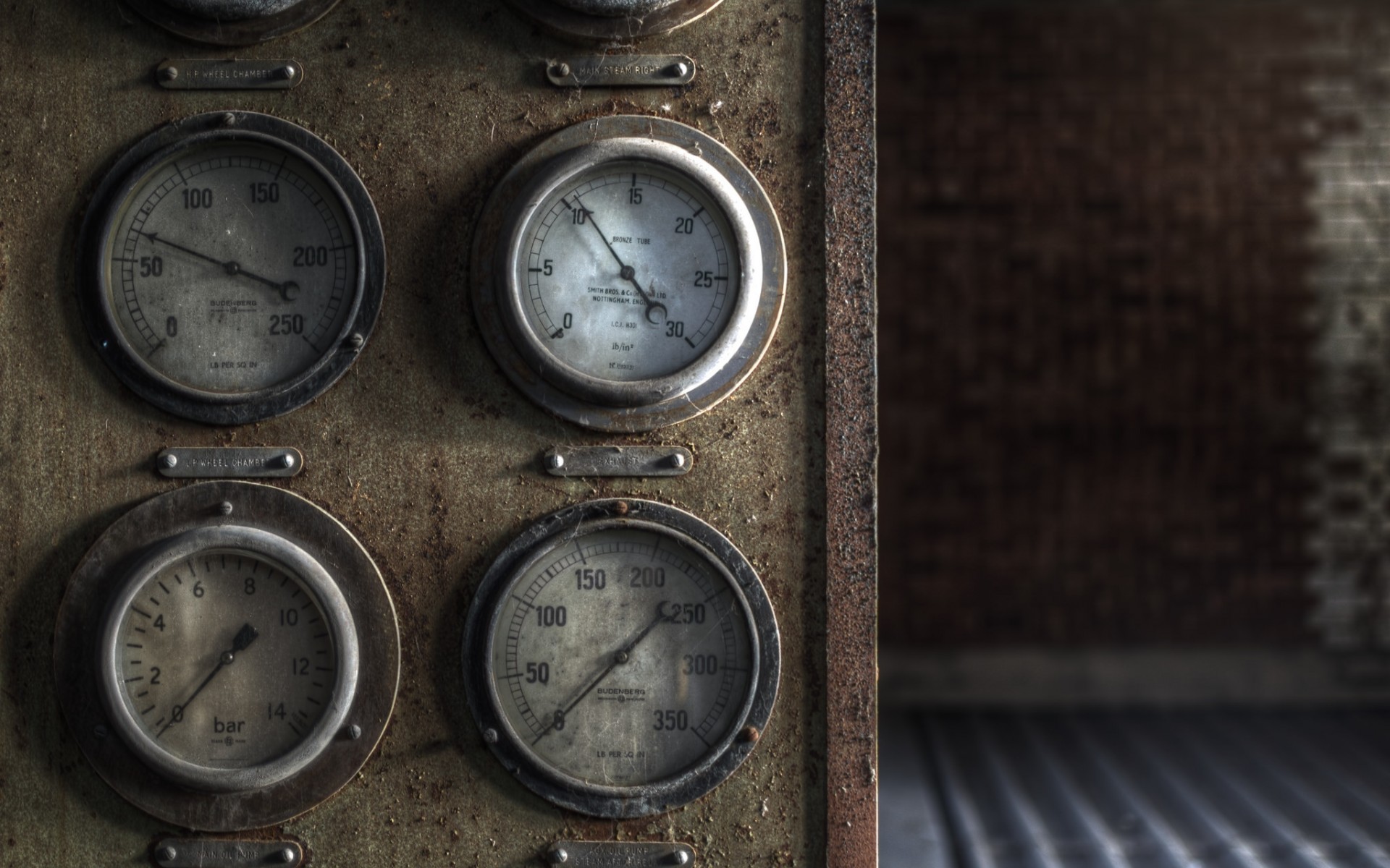 Description: A set of four gauges on a metal panel with a striped wall behind it and a tiled floor.