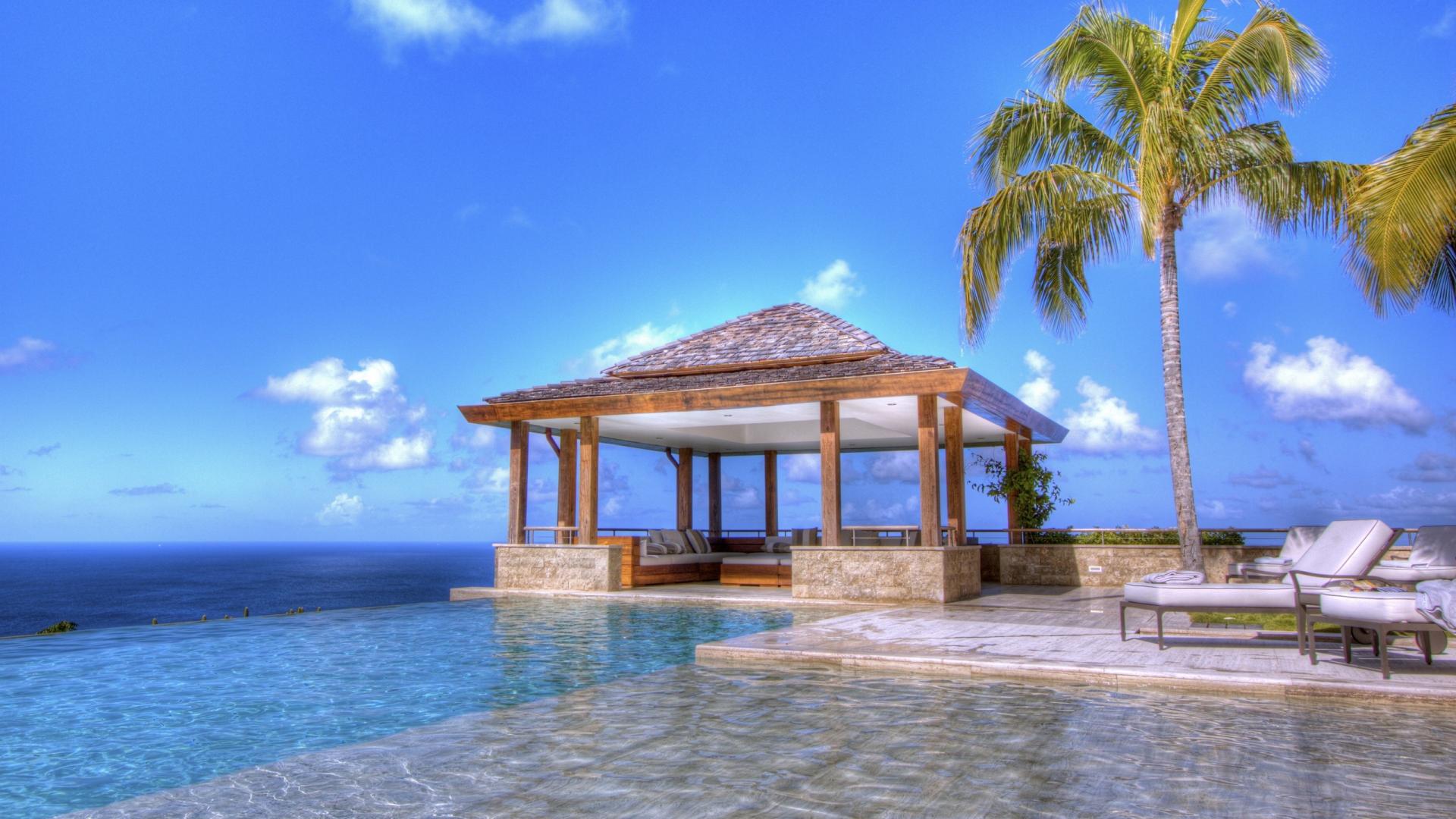 Description: A gazebo sitting next to a large body of water with a palm tree in the background and a lounge chair in the foreground.
