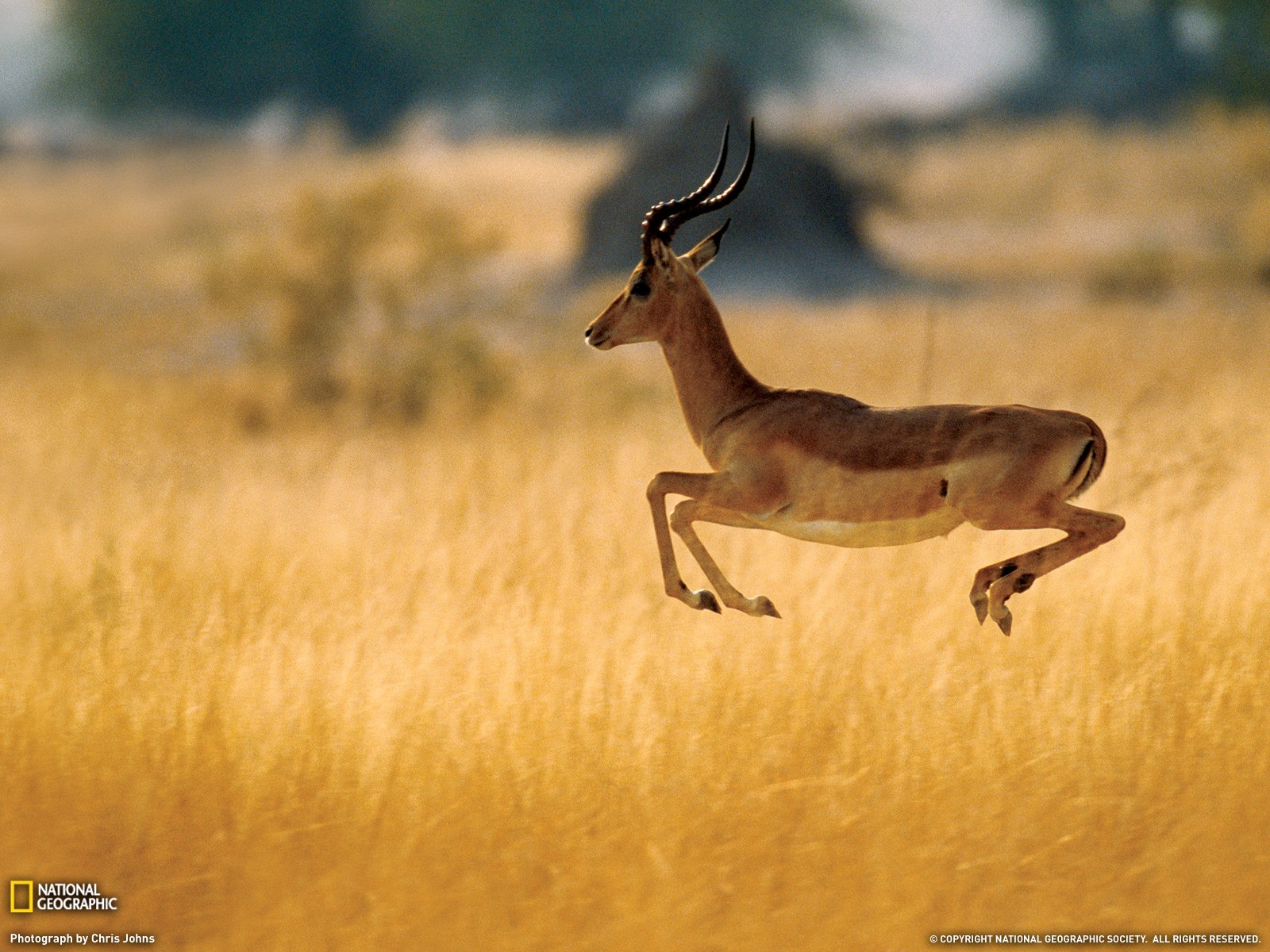 Description: A gazelle running through a field of tall grass with a gazelle in the background in the distance.
