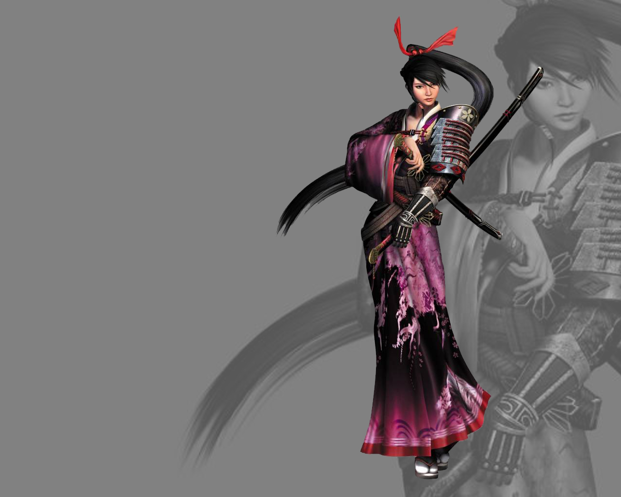Description: A woman in a geisha outfit holding a sword and a samurai sword in her hand.