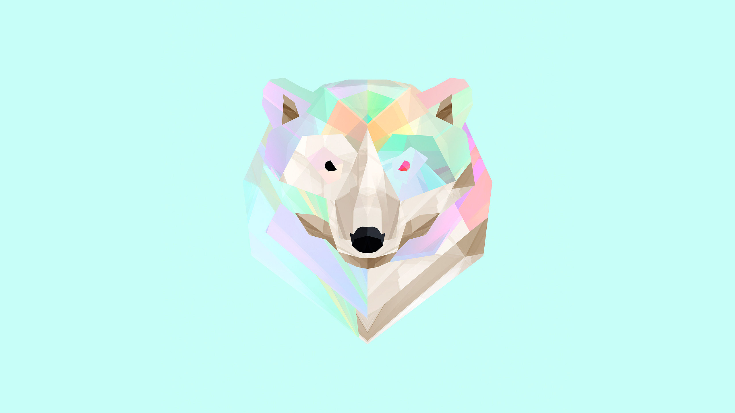 Description: A geometric polar bear head on a blue background with a pastel background and a pastel background to the left.
