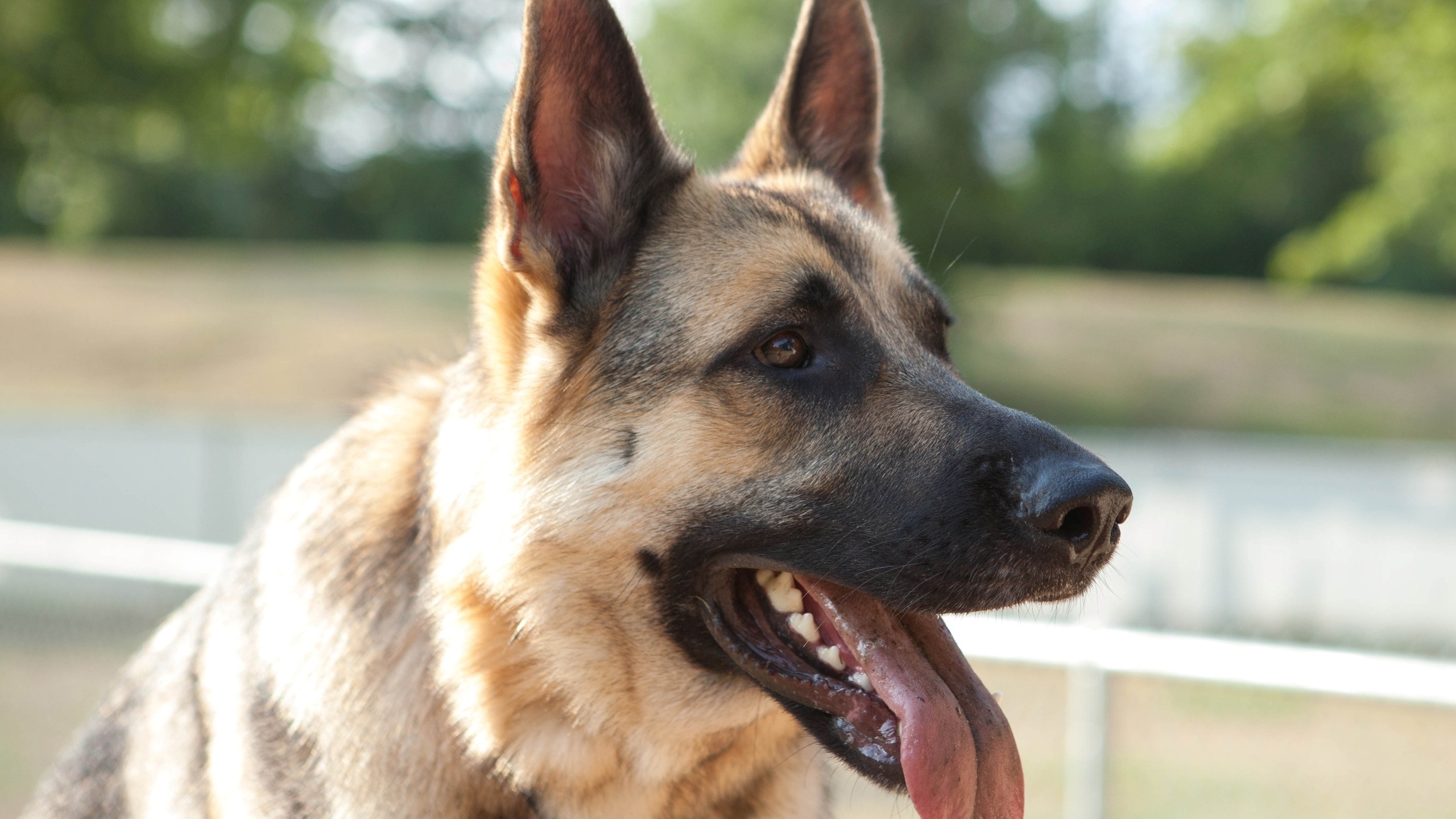 Description: A german shepherd dog with its tongue out looking at the camera with a blurry background of trees and a fence.