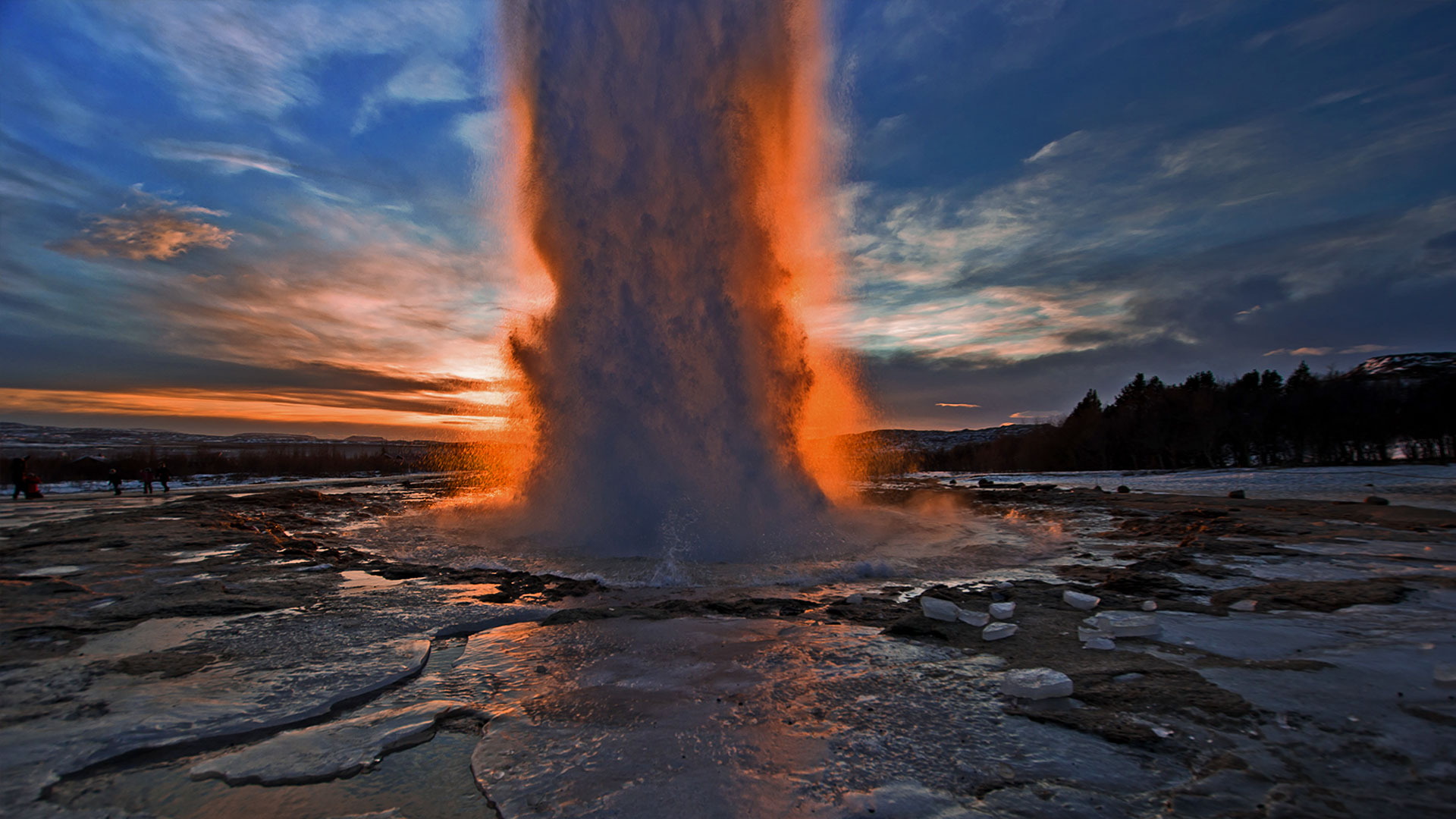 Description: A geyser spewing water into the sky at sunset or dawn with people standing around it.