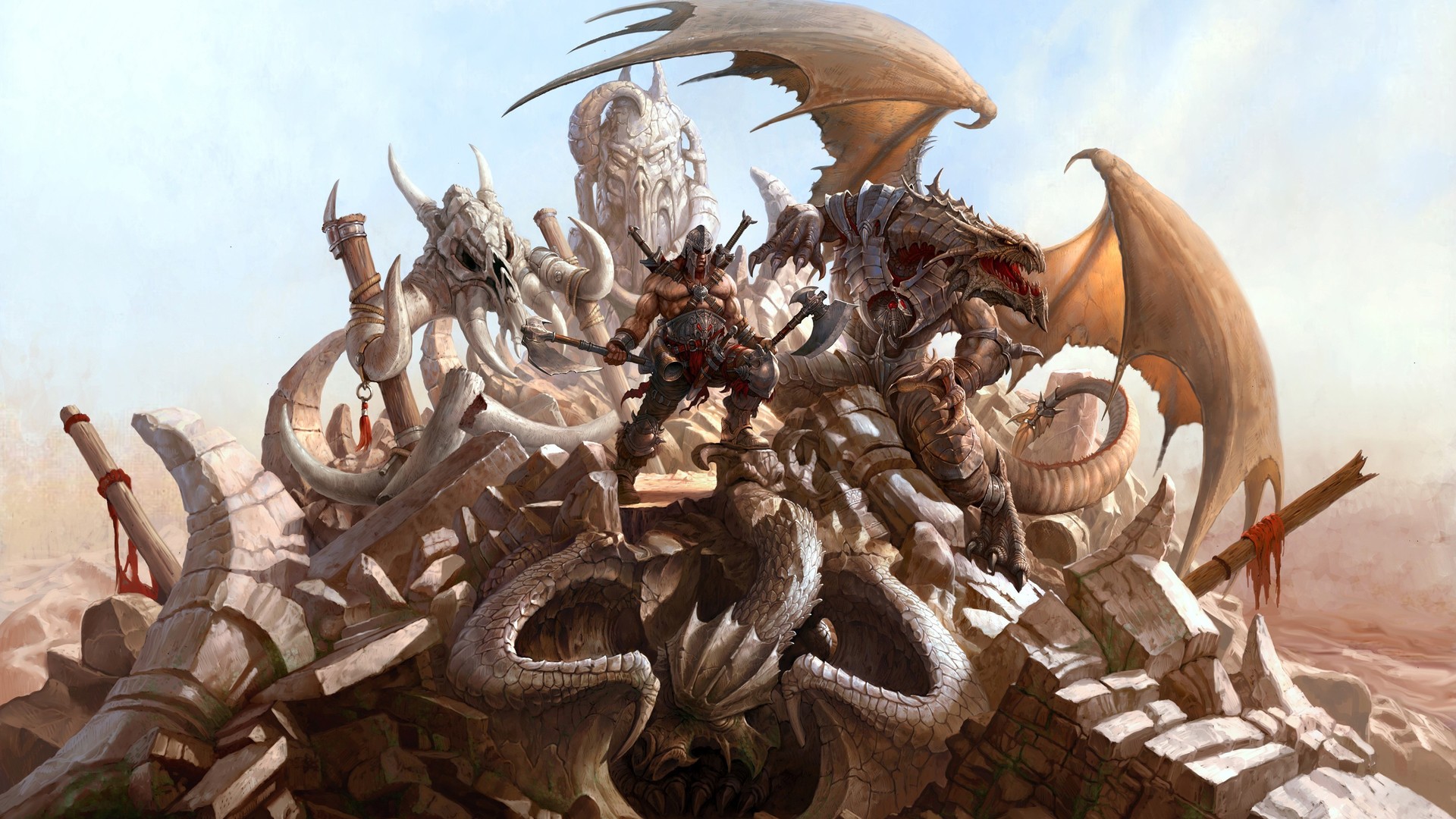 Description: A giant dragon with horns and horns on it's back standing in front of a pile of smaller dragon like creatures.