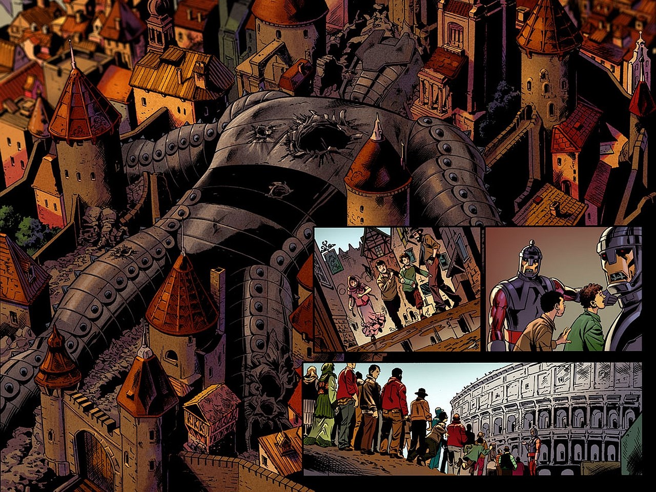 Description: A comic book page with a giant robot in the middle of a city with people standing around it and a giant robot in the middle of the scene.