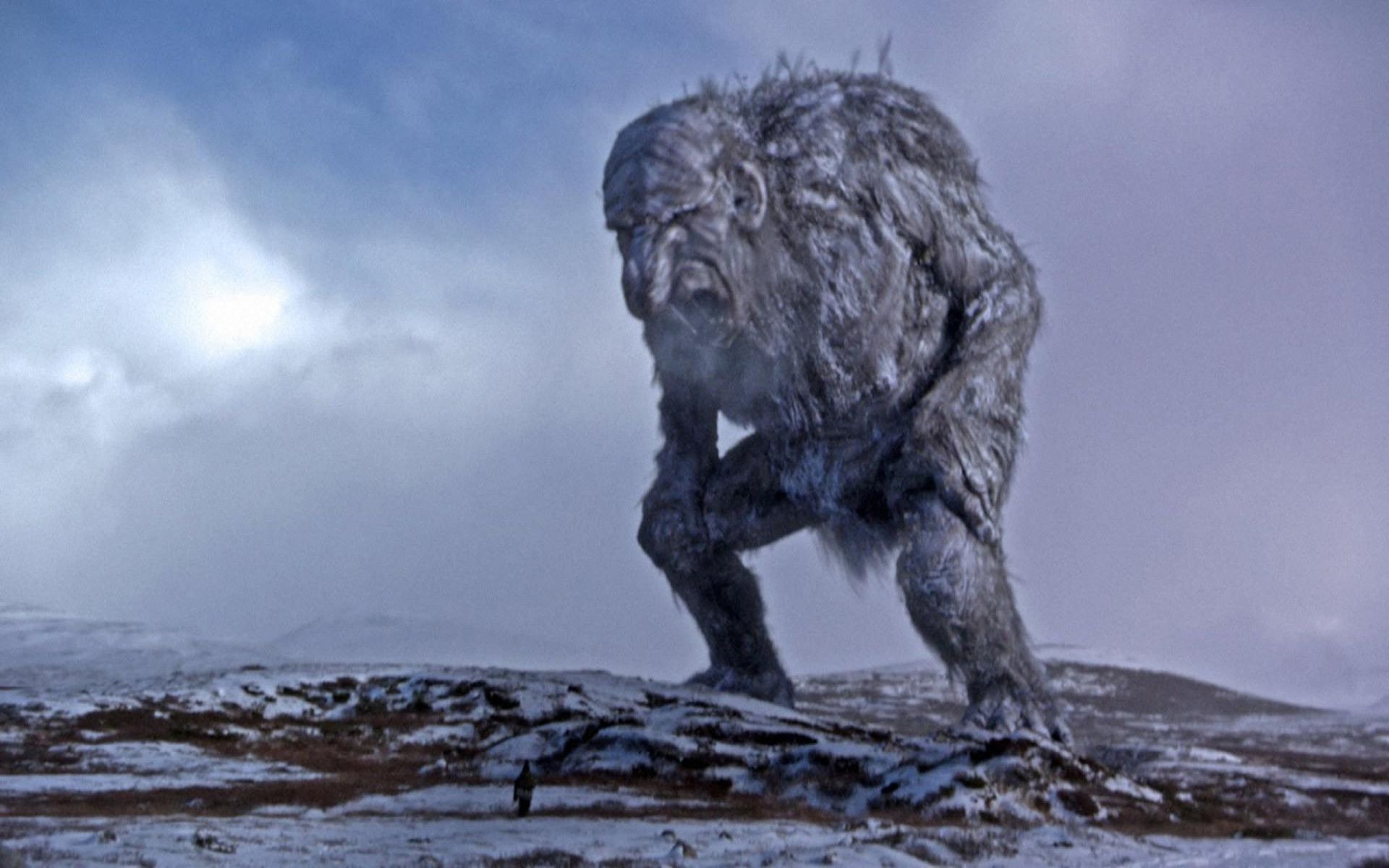 Description: A giant yet standing on a snowy hill with a sky background and clouds in the background.