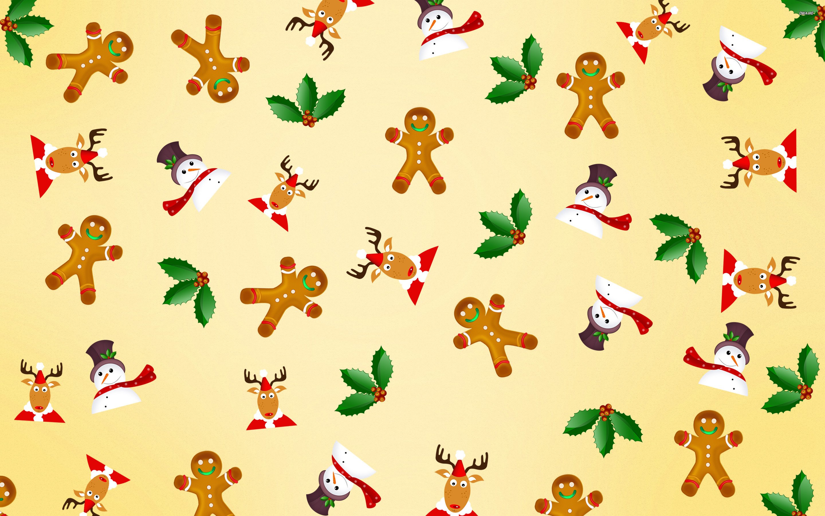 Description: A pattern of christmas themed gingerbreads and reindeers on a yellow background with green leaves and red bows.