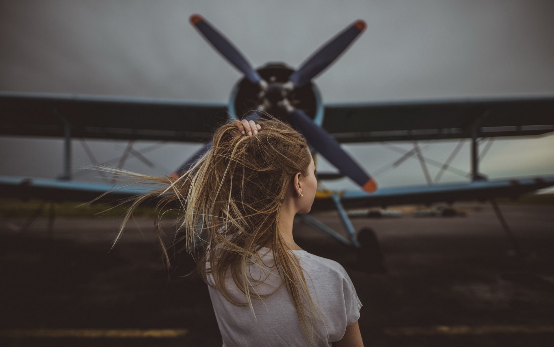 Description: A girl standing in front of a small airplane with long hair blowing in the wind and a propeller on the back of the plane.