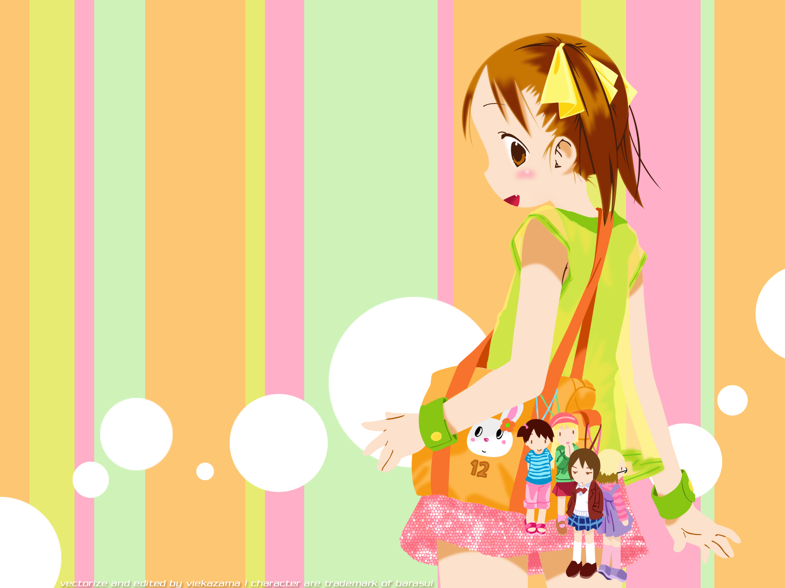 Description: A girl with a backpack and a doll in front of a striped background with bubbles in the air and a small girl with a backpack in the foreground.