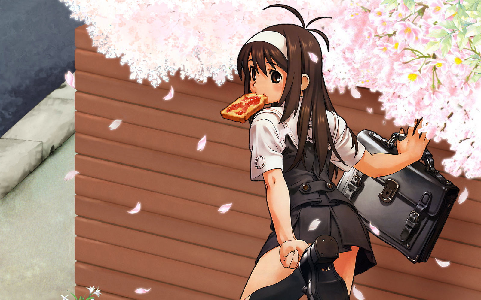 Description: A girl with a bag and a pizza in her hand walking down a street with cherry blossoms on the trees.
