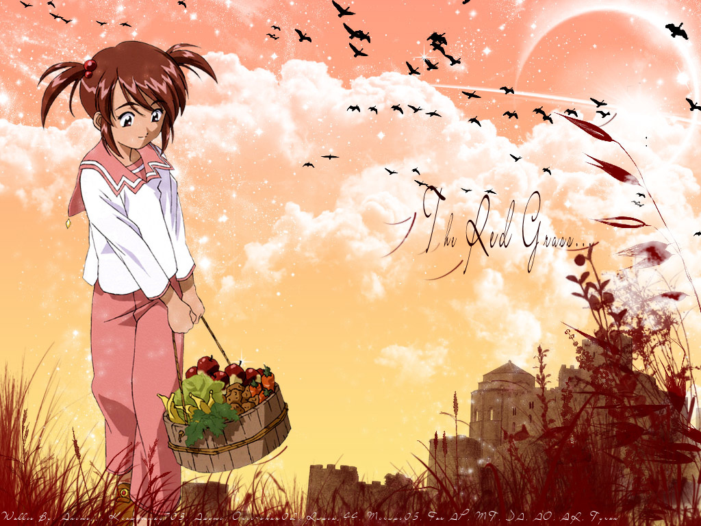 Description: A girl holding a basket of fruit in a field with birds flying overhead in the sky above her and a city in the background.
