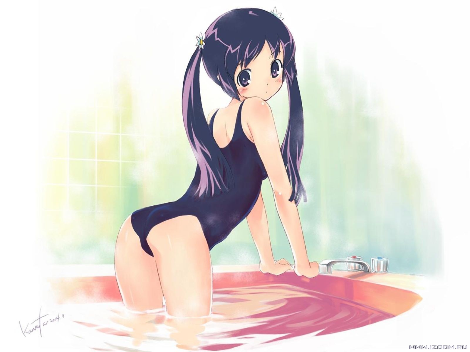 Description: A girl in a bathing suit is sitting in a bathtub with her legs crossed and her head in the water.