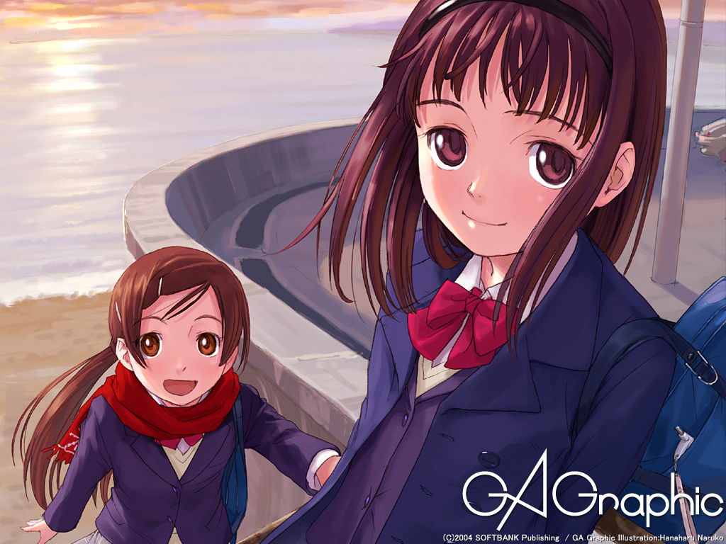 Description: A girl and a girl in a suit and scarf standing next to each other on a beach with a body of water in the background.