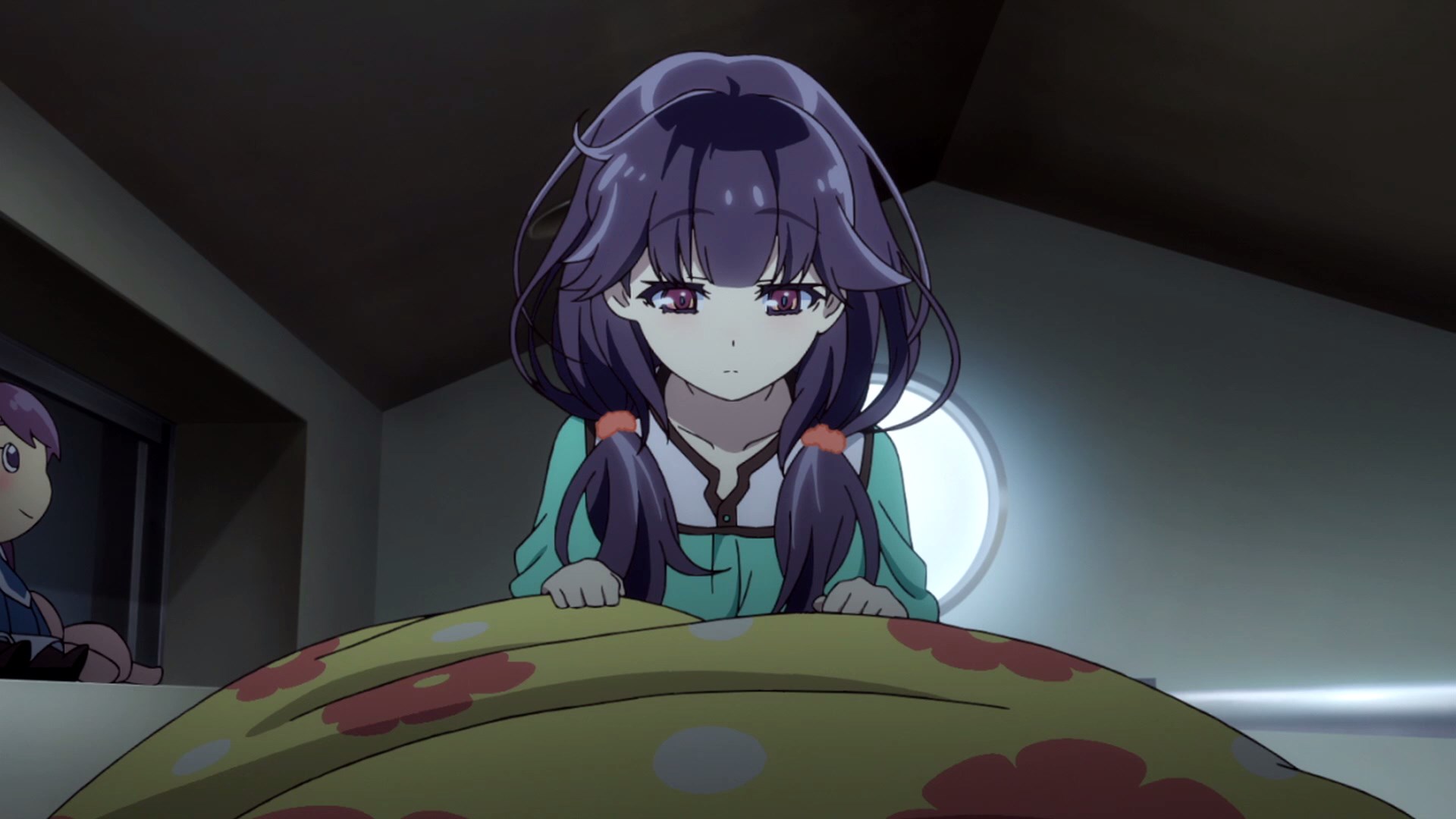 Description: A girl sitting on a bed with a pillow in front of her and a man standing behind her in a dimly lit room.