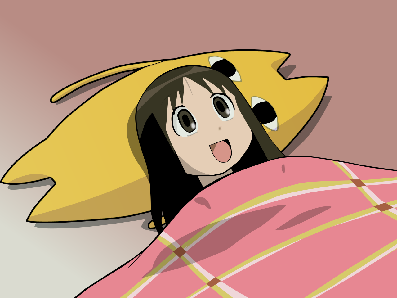 Description: A girl laying in bed with a yellow hat on her head and a pink blanket on her head and a yellow pillow on her head.