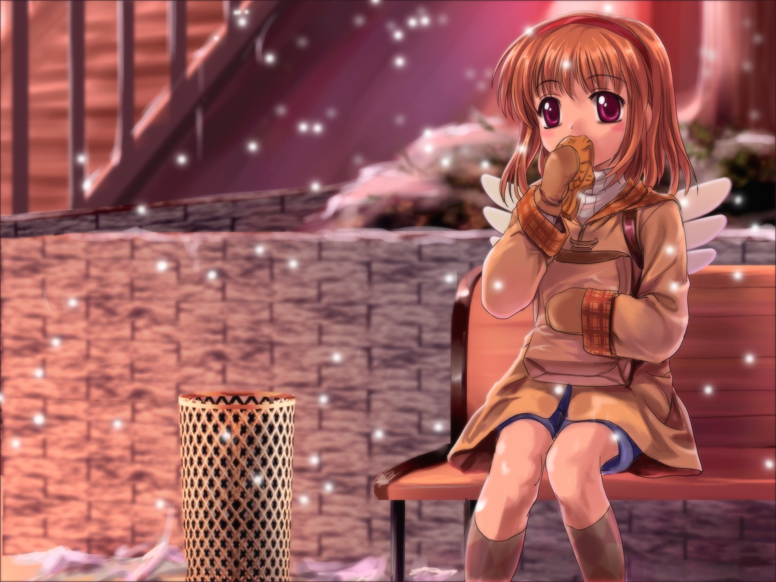 Description: A girl sitting on a bench with a cup of coffee in her hand and a basket of cookies in front of her.