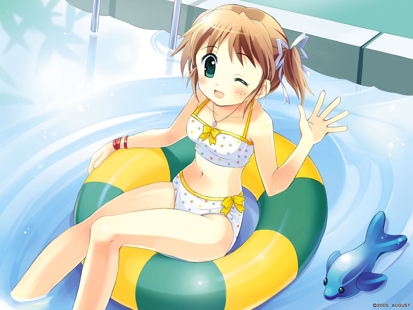 Description: A girl in a bikini is floating on a raft in the water with a dolphin nearby and a fish swimming nearby.