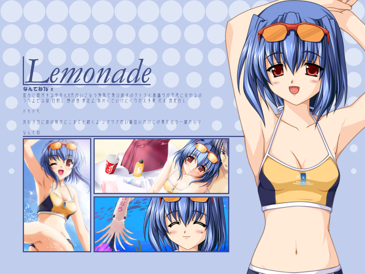 Description: A girl in a bikini top and sunglasses with her arms behind her head and a cartoon character in the background.