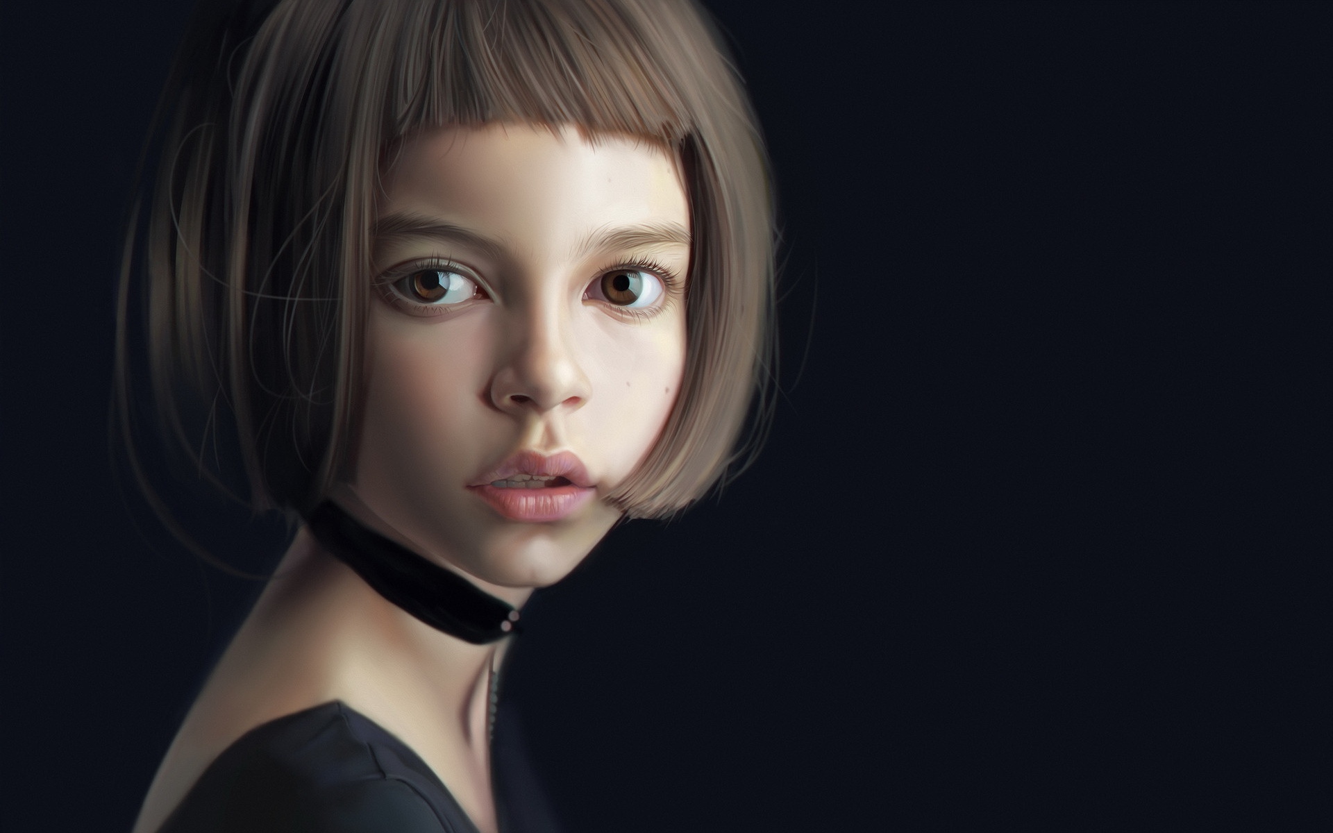 Description: A digital painting of a young girl with a choker around her neck and a black background.