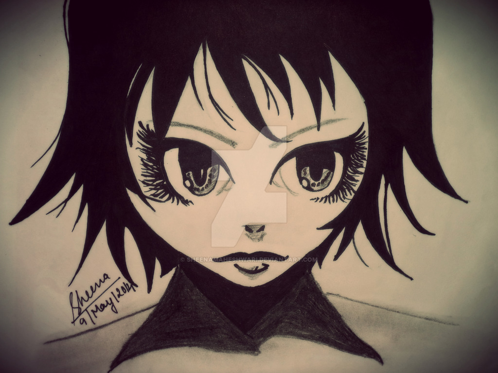 Description: A drawing of a girl with black hair and big eyes with a black collared shirt on and a black collared shirt on.