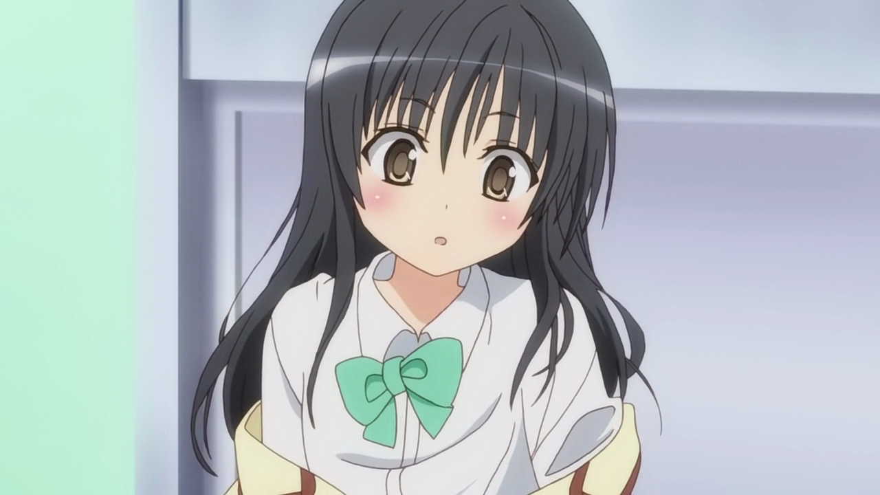 Description: A girl with long black hair and a bow tie standing in a room with a green wall and a door.