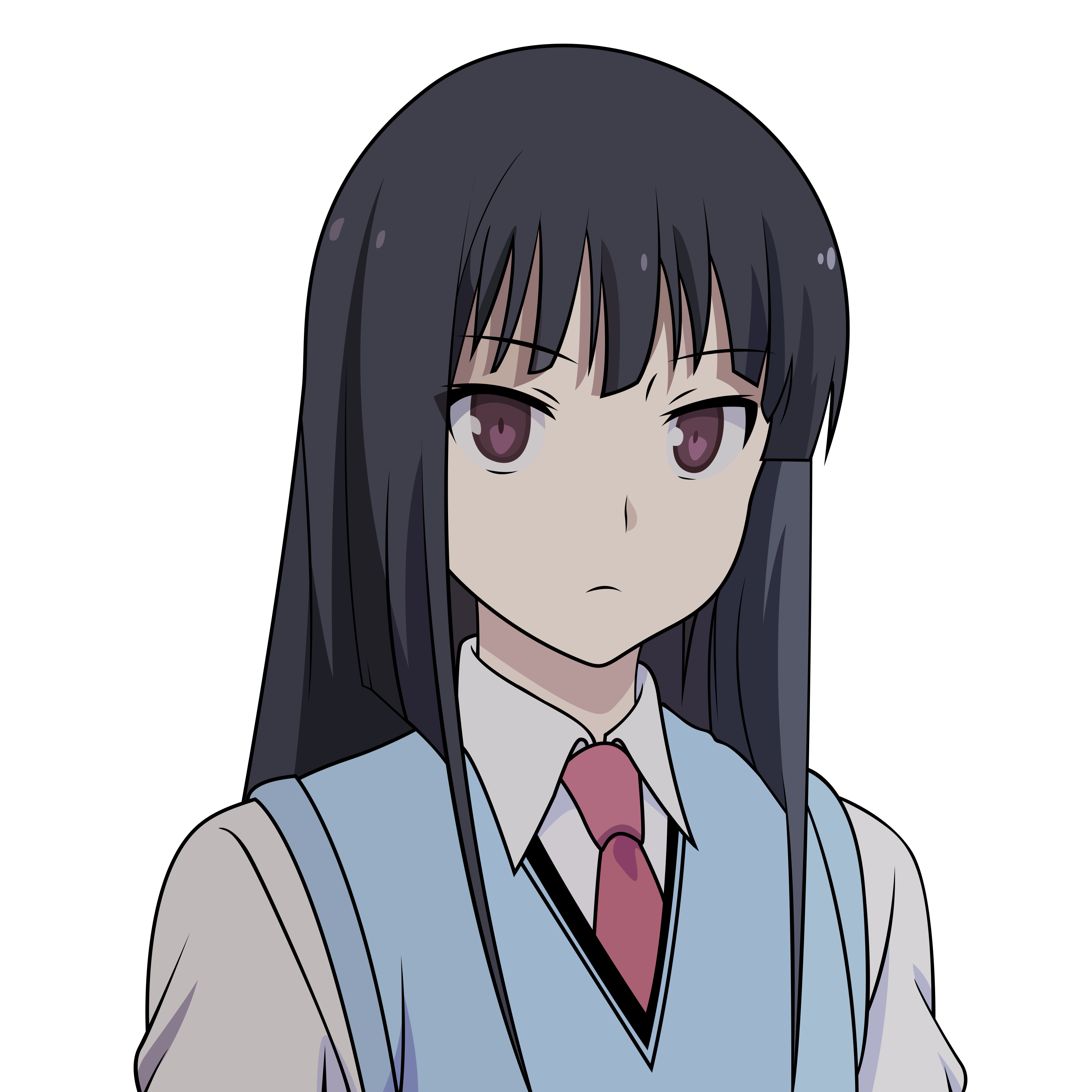 Description: A girl with long black hair wearing a vest and tie with a red tie on her neck and a white shirt with a red tie.