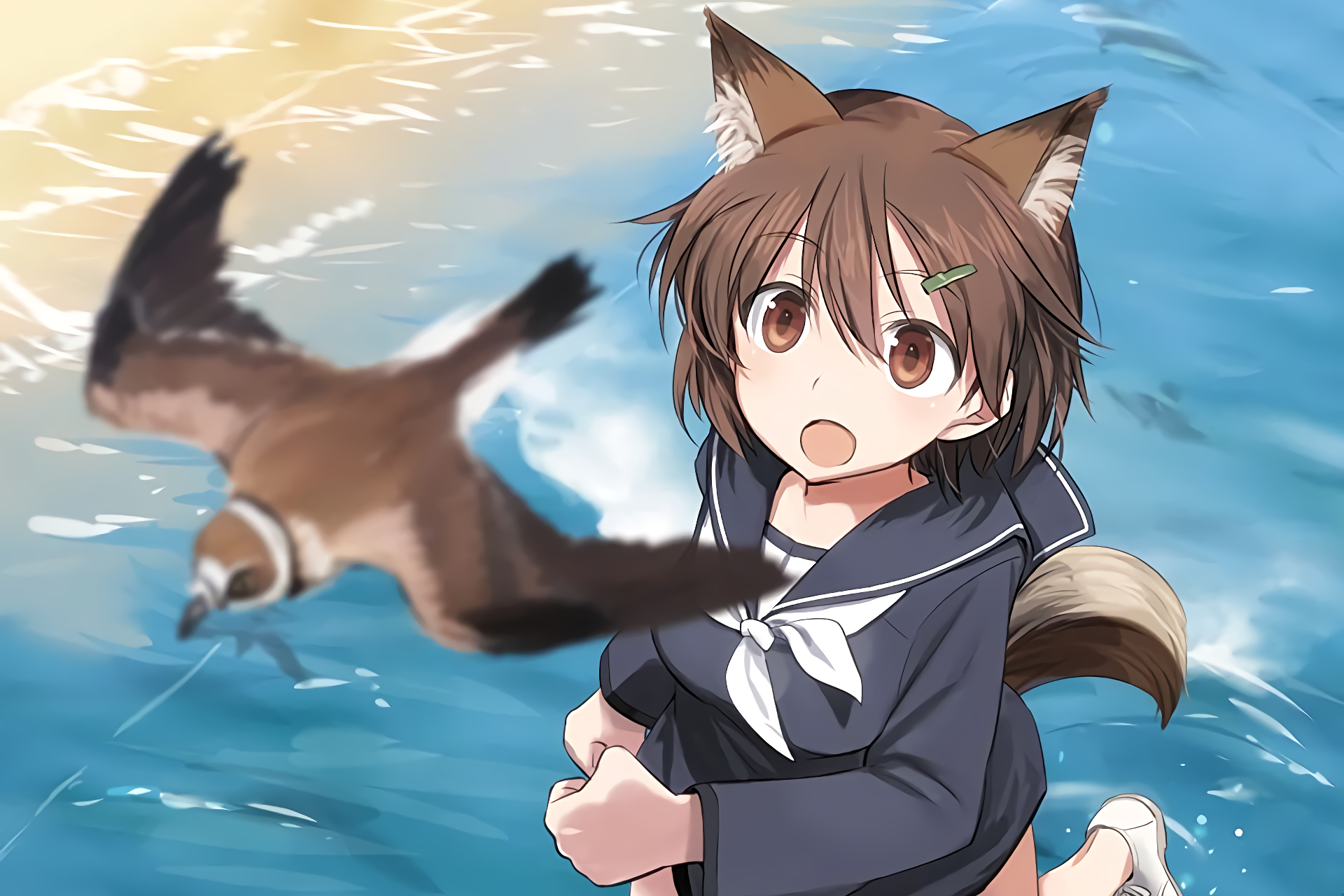Description: A girl in a black shirt and a bird flying over her head in the water with a bird flying above her.