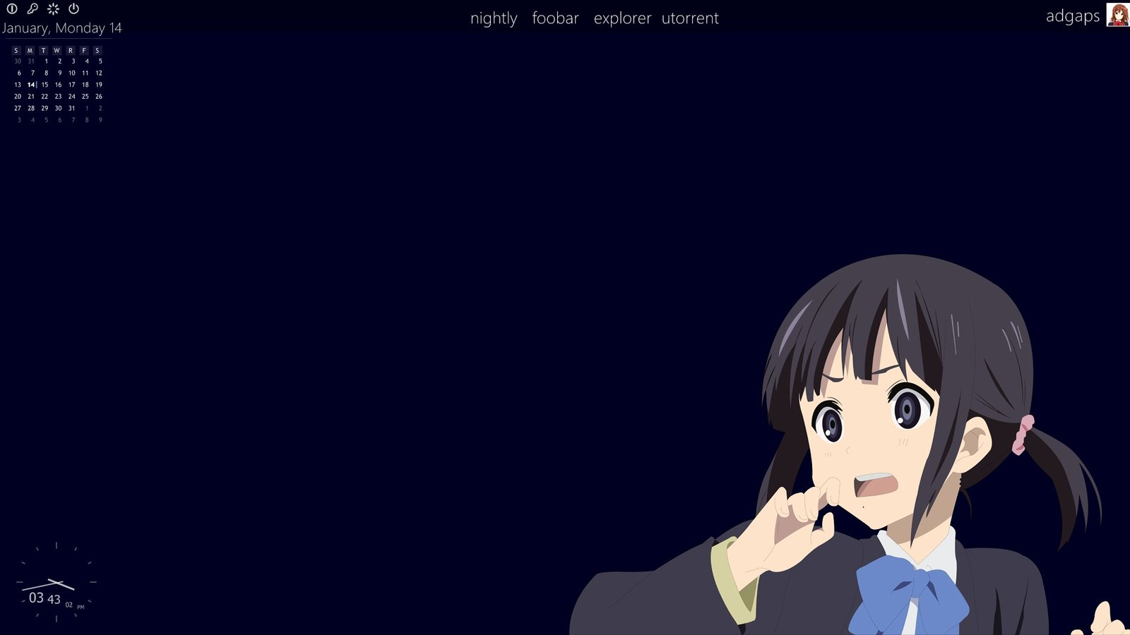 Description: A girl in a black shirt and tie is pointing at something on a screen with a dark background and a clock.