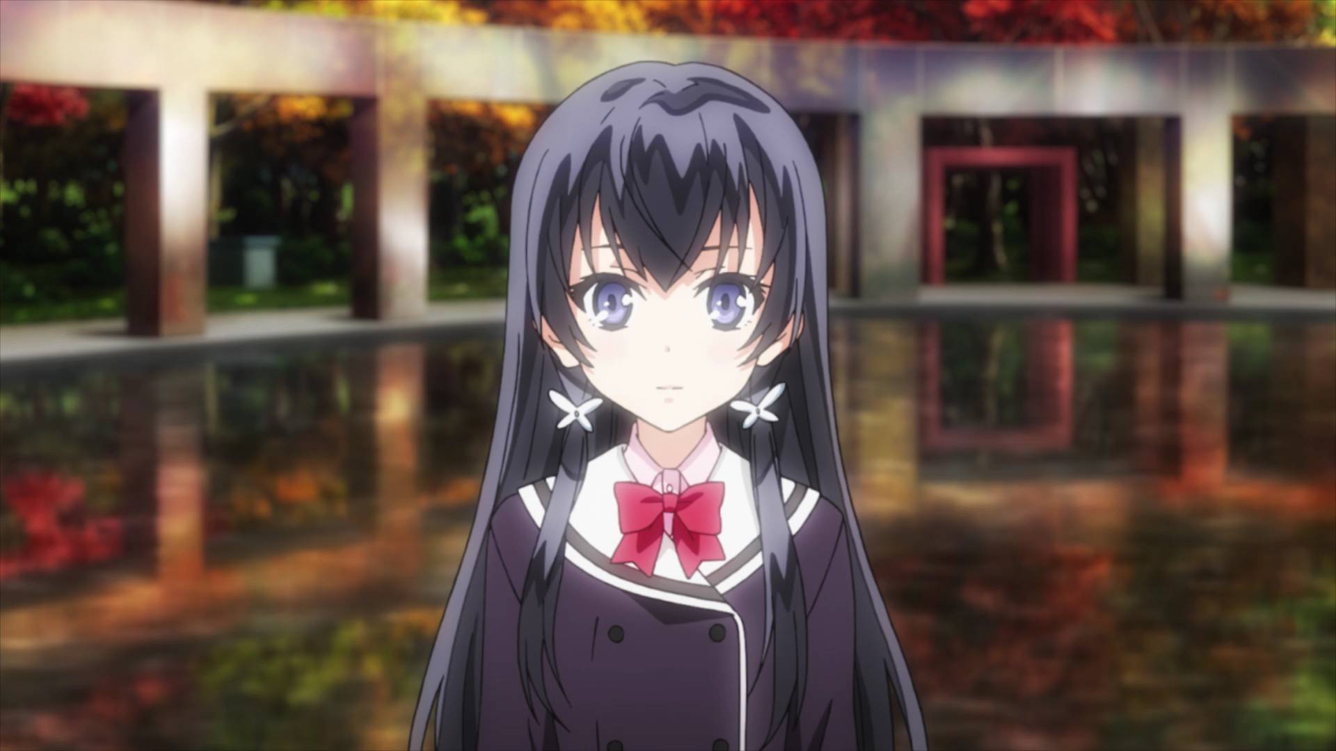 Description: A girl in a black and white outfit standing in front of a pond with trees in the background and a building in the background.