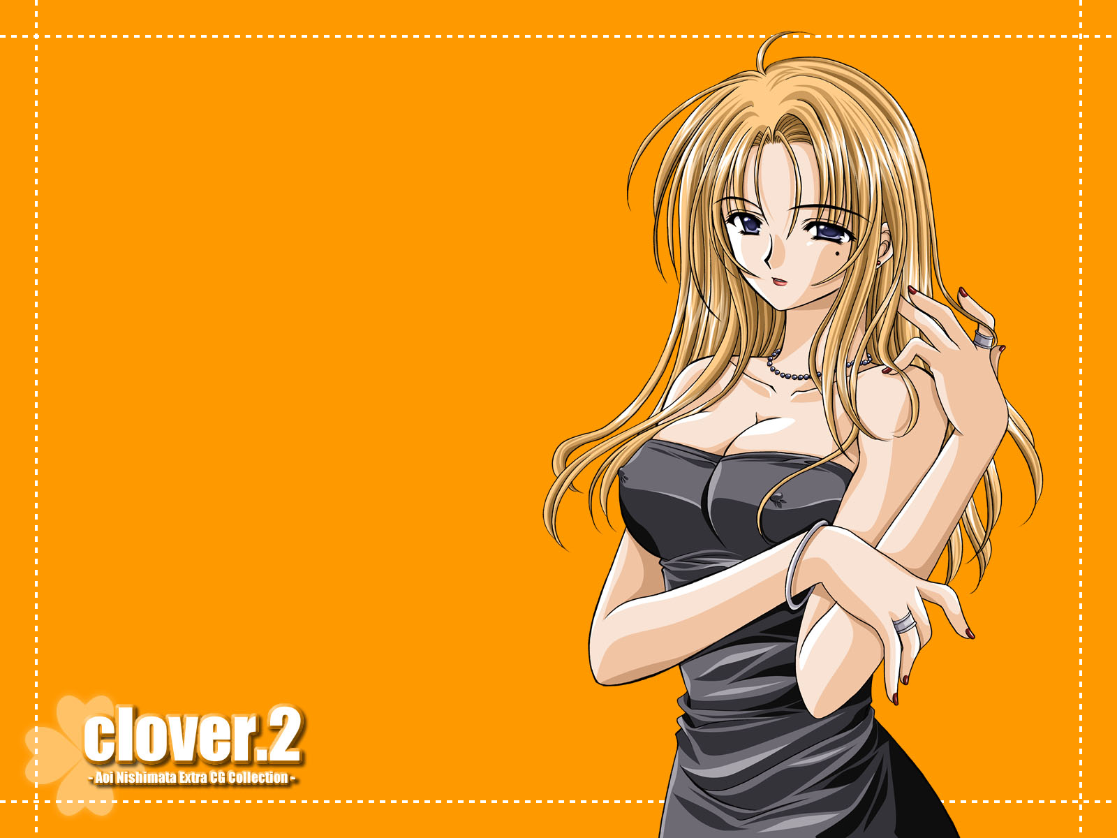 Description: A girl in a black dress with long blonde hair and a black dress with a black top on her shoulders.