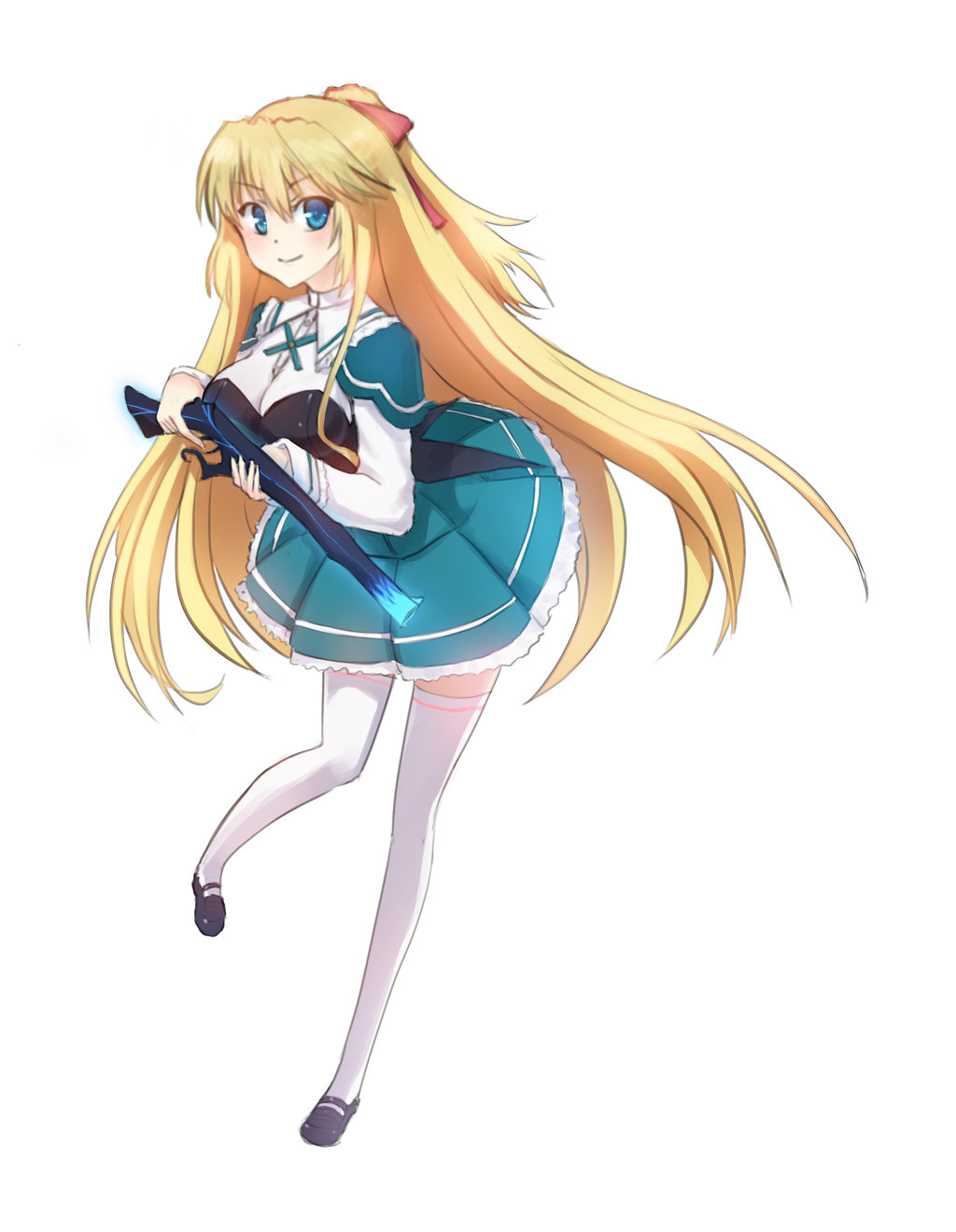Description: A girl with long blonde hair and a blue dress holding a sword in her hand and a white background.