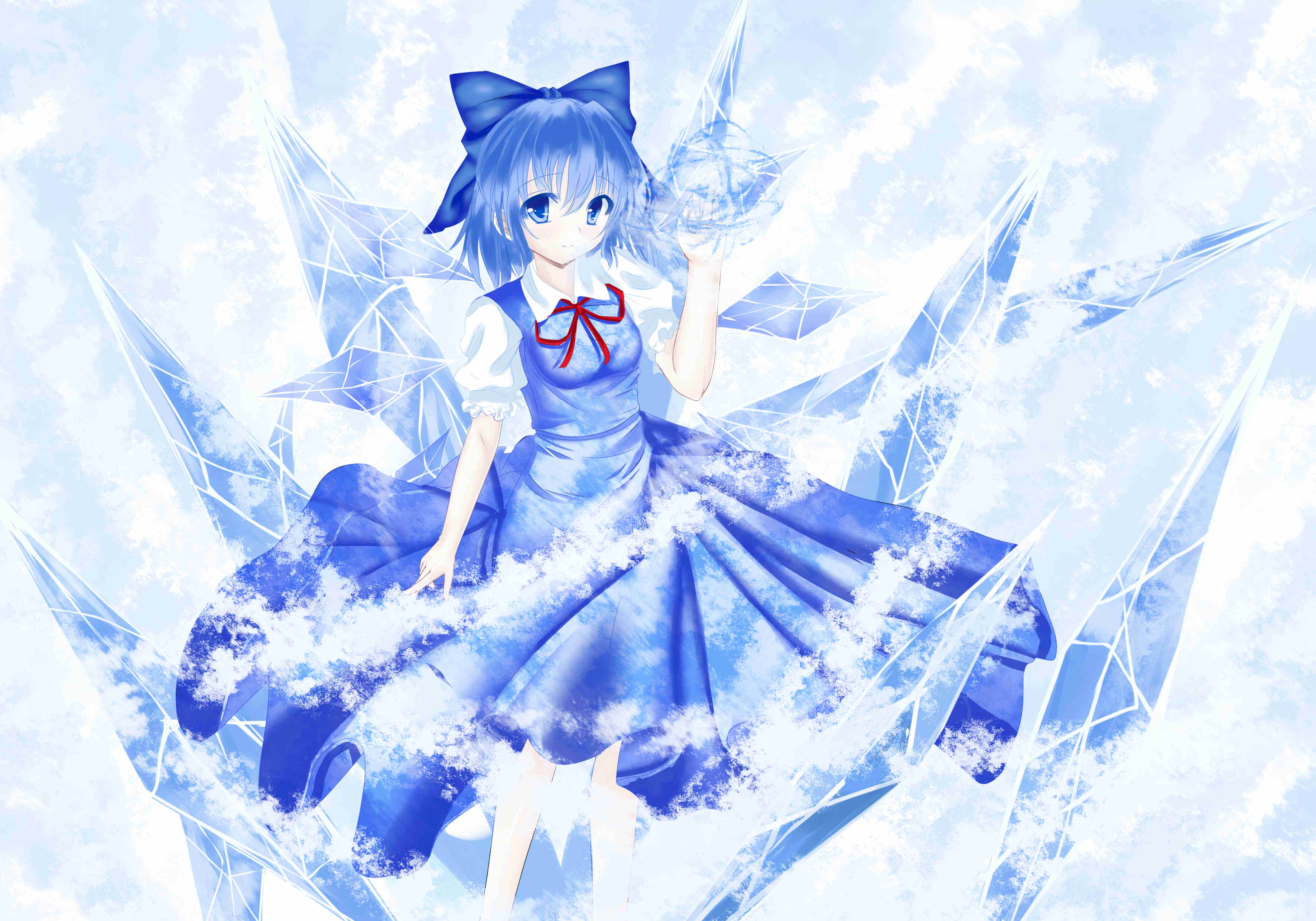 Description: A girl in a blue dress with a bow on her head and wings flying through the air.